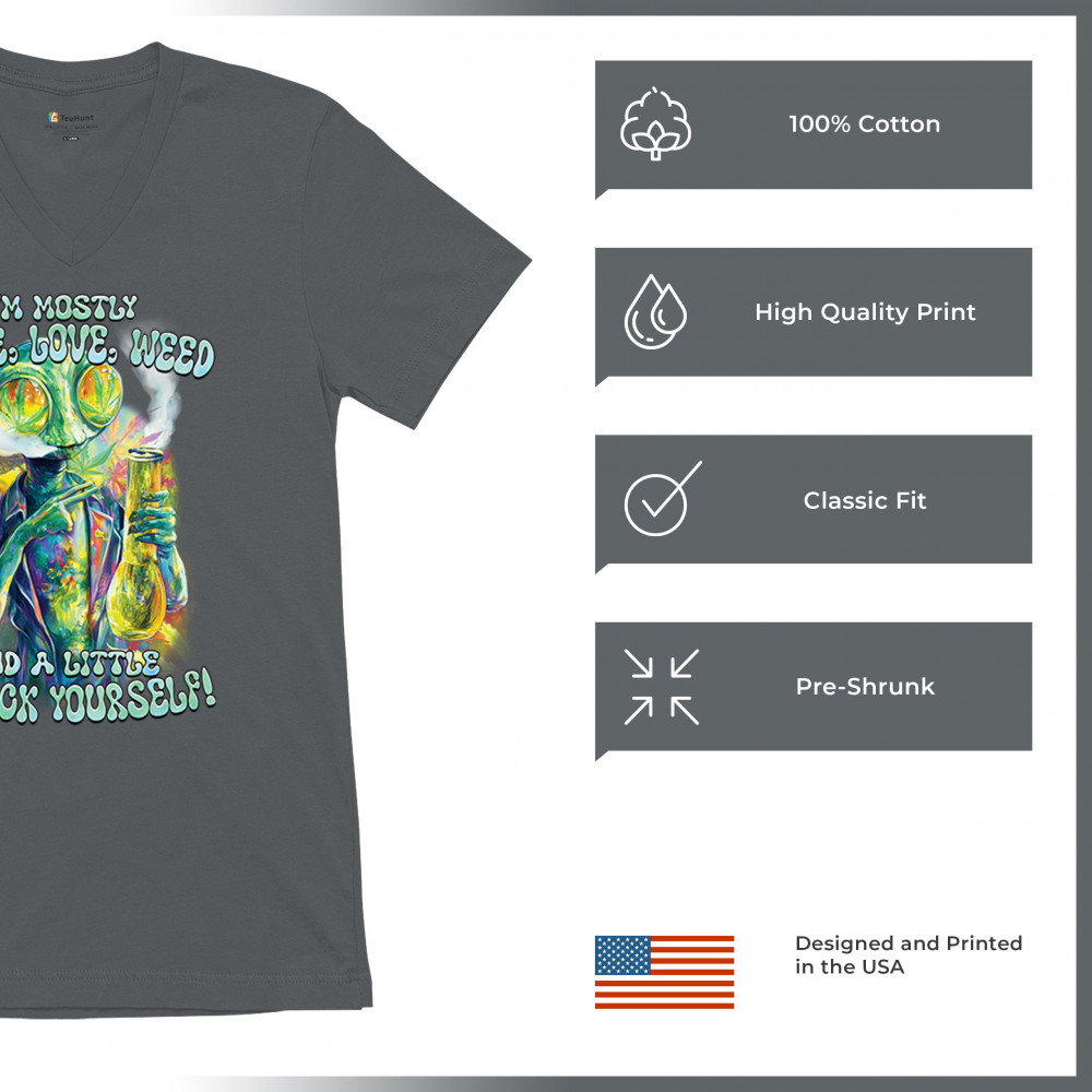 This bold alien stoner design fuses colorful weed art with raw honesty and stoner attitude. Featuring a high alien and vibrant peace love weed vibe, it's perfect for unapologetic smokers who blend kindness and truth. Wear it at festivals, smoke sessions, or whenever your mood is 80% peace, 20% sarcasm. It’s humor, cannabis culture, and bold energy rolled into one.