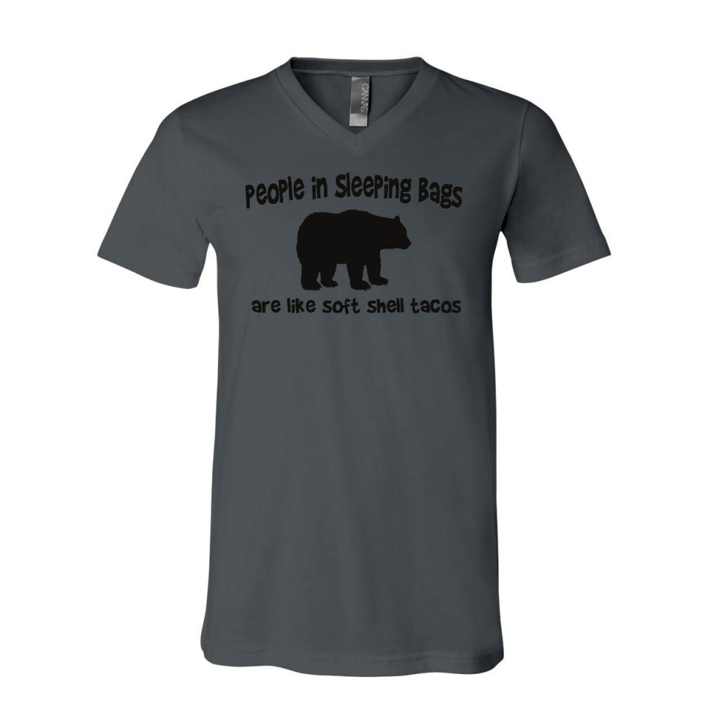 PEOPLE ARE SOFT SHELL TACOS v-neck t-shirt funny camping brown bear tee charcoal