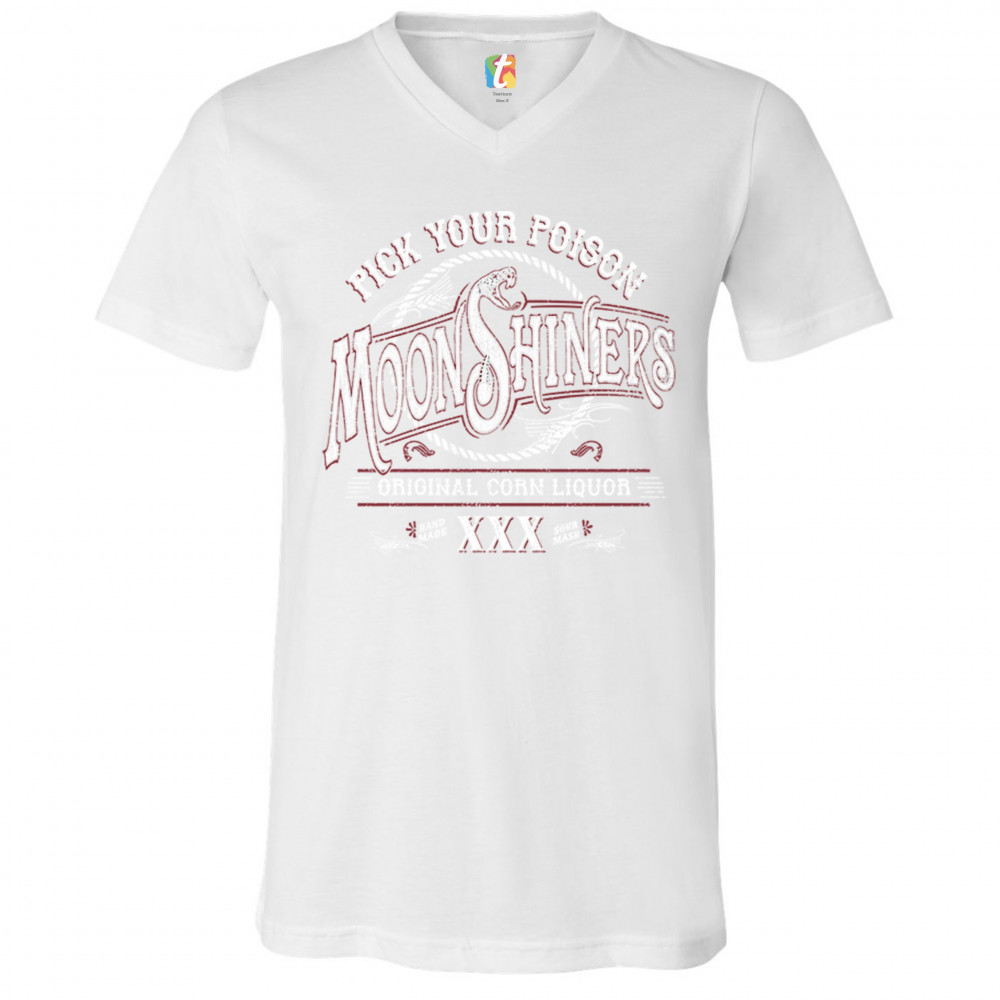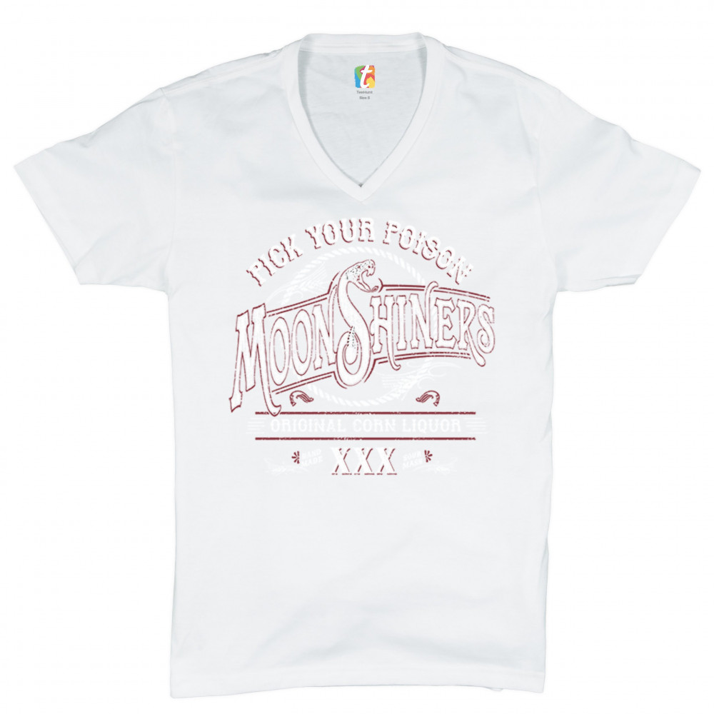 PICK YOUR POISON MOONSHINERS v-neck t-shirt original corn liquor xxx tee white