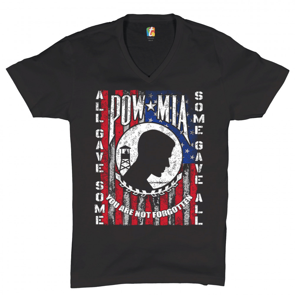 A patriotic print featuring the combination of the National League of Families' POW/MIA flag with a distressed American flag. On the sides of the flag it features the phrase: "All Gave Some, Some Gave All". Great choice to wear on Patriot's Day, Memorial