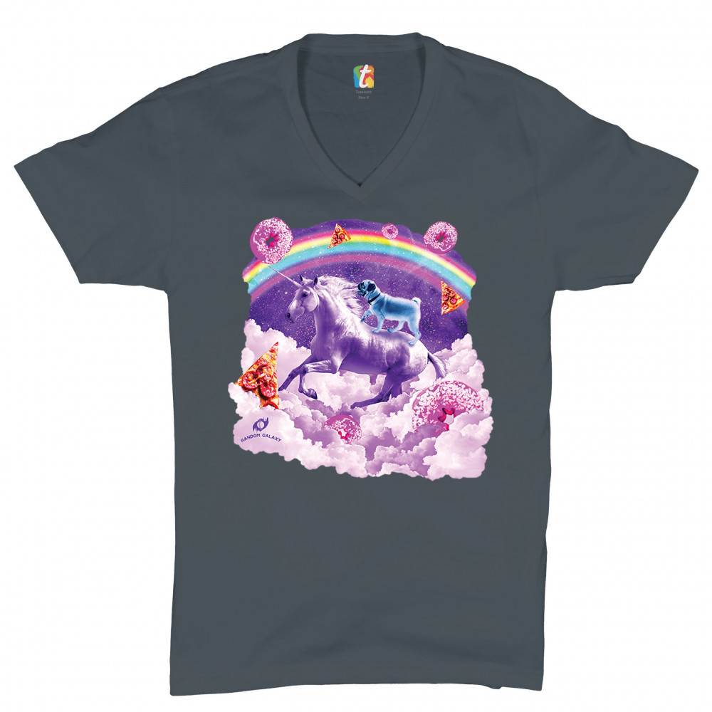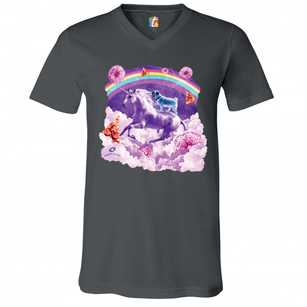 PUG RIDING A UNICORN IN CLOUDS v-neck t-shirt space rainbow trippy donuts tee charcoal
