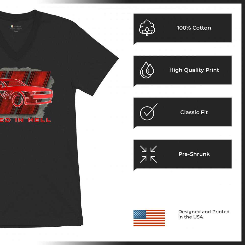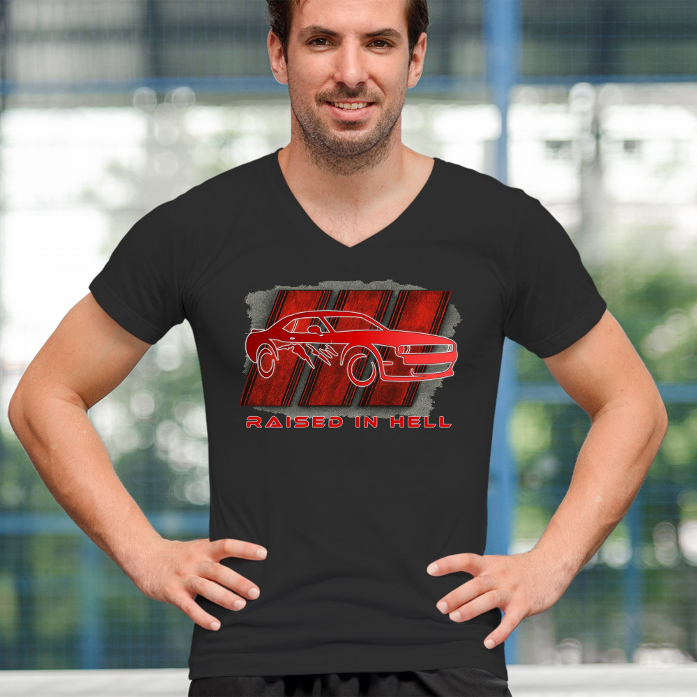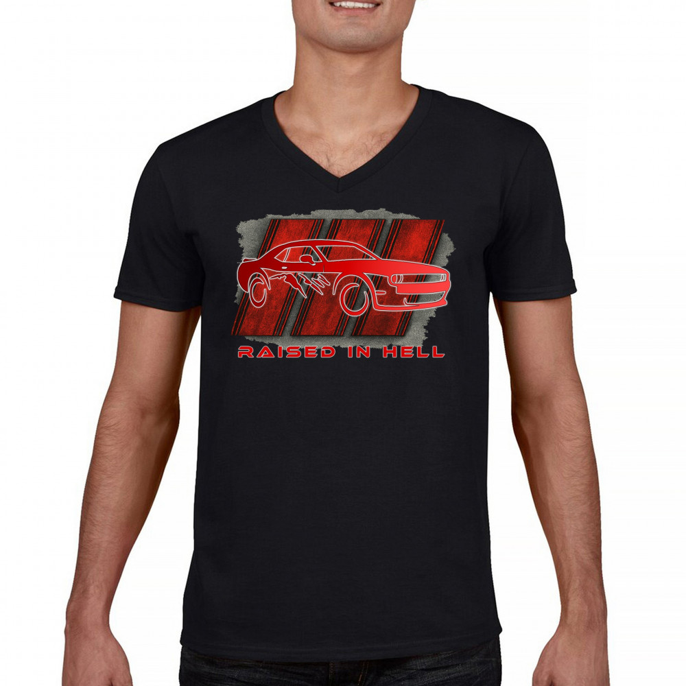 RAISED IN HELL MUSCLE CAR v-neck t-shirt american performance power rt v8 tee black