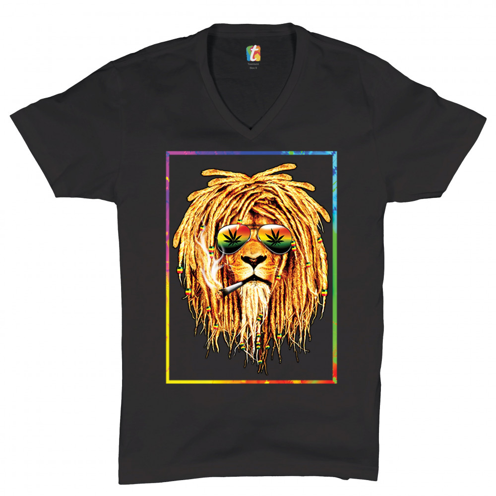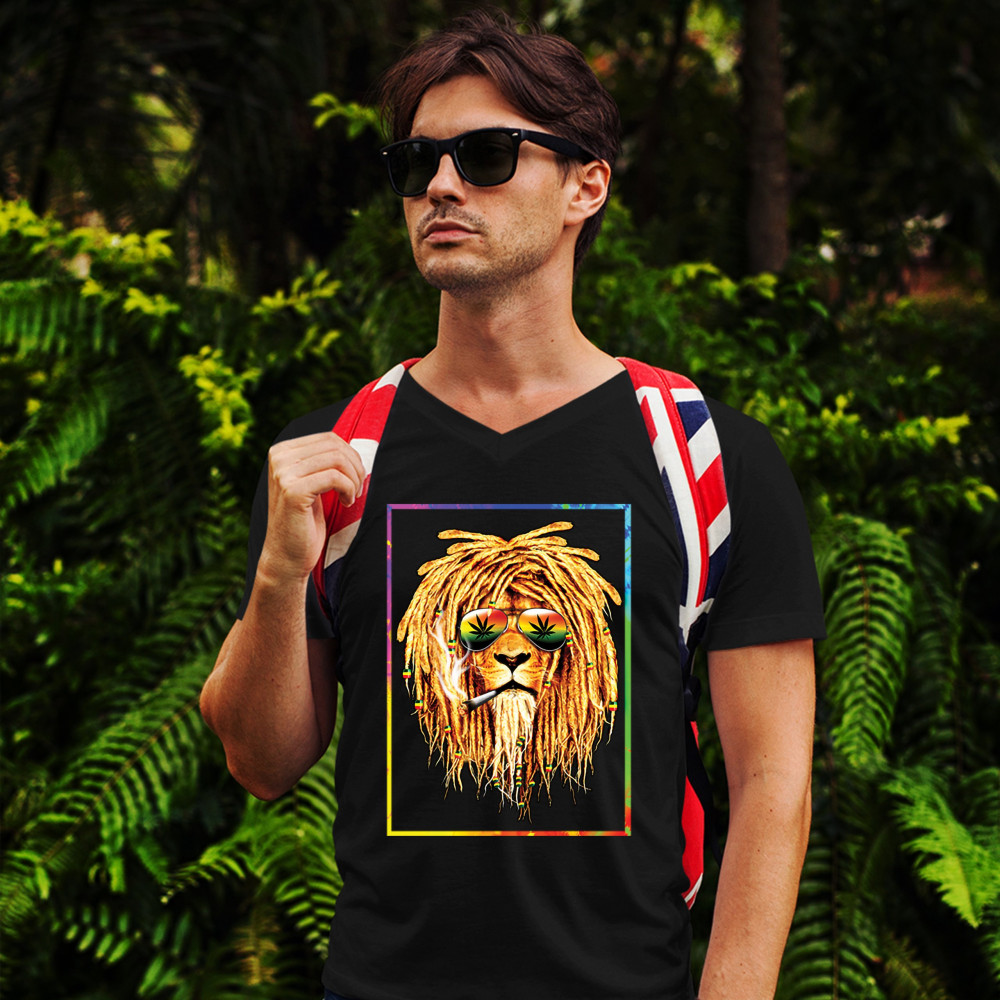 A print featuring a lion with dreadlocks smoking a joint and wearing sunglasses with marijuana leaves reflected in the them. The beads on the lion's dreadlocks and the glasses are painted with traditional Jamaican colors. Great choice for a pot aficionado