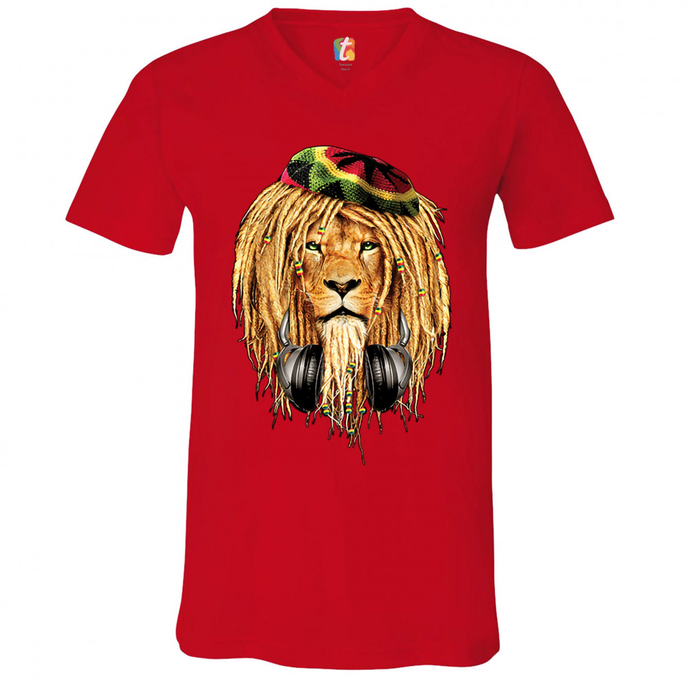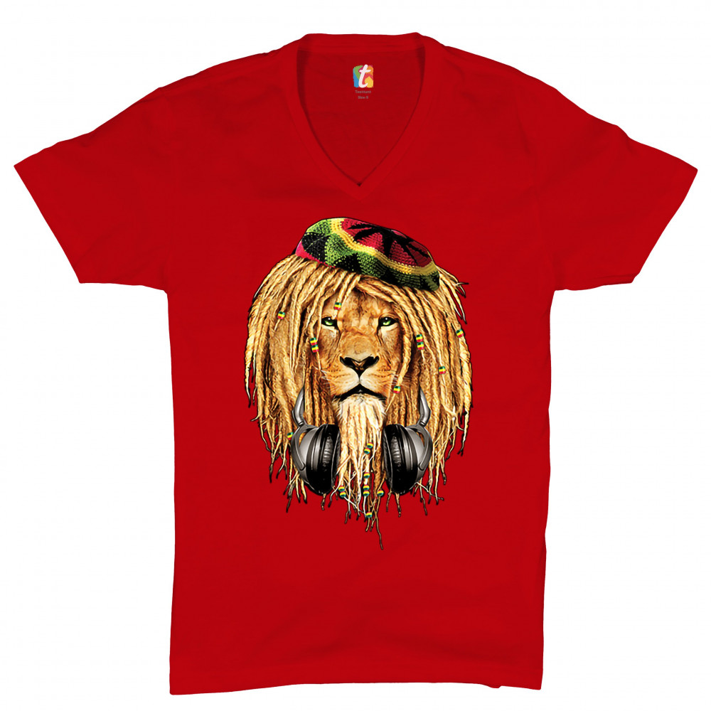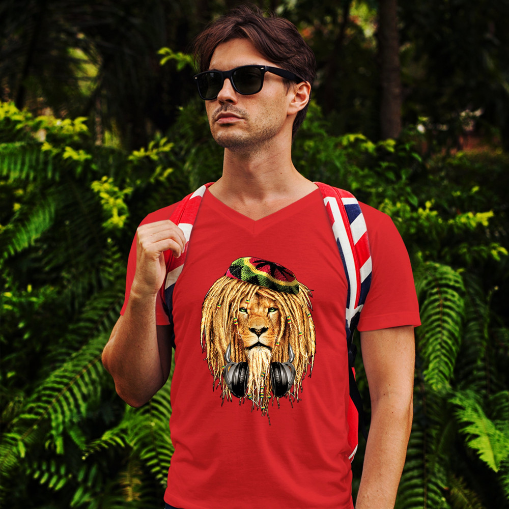 RASTA LION WITH HEADPHONES v-neck t-shirt jah jamaica reggae 420 culture tee red