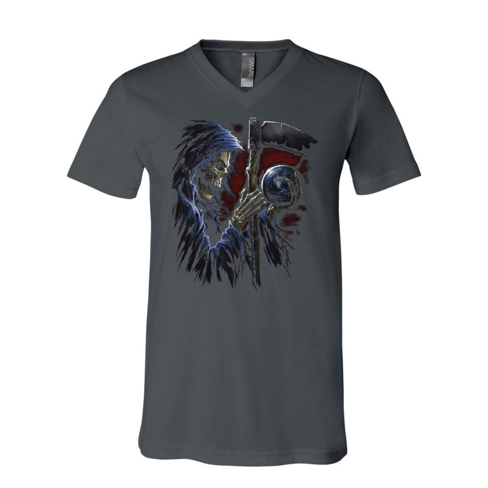 REAPER SPHERE SCYTHE v-neck t-shirt death skull creepy scary monster tee charcoal