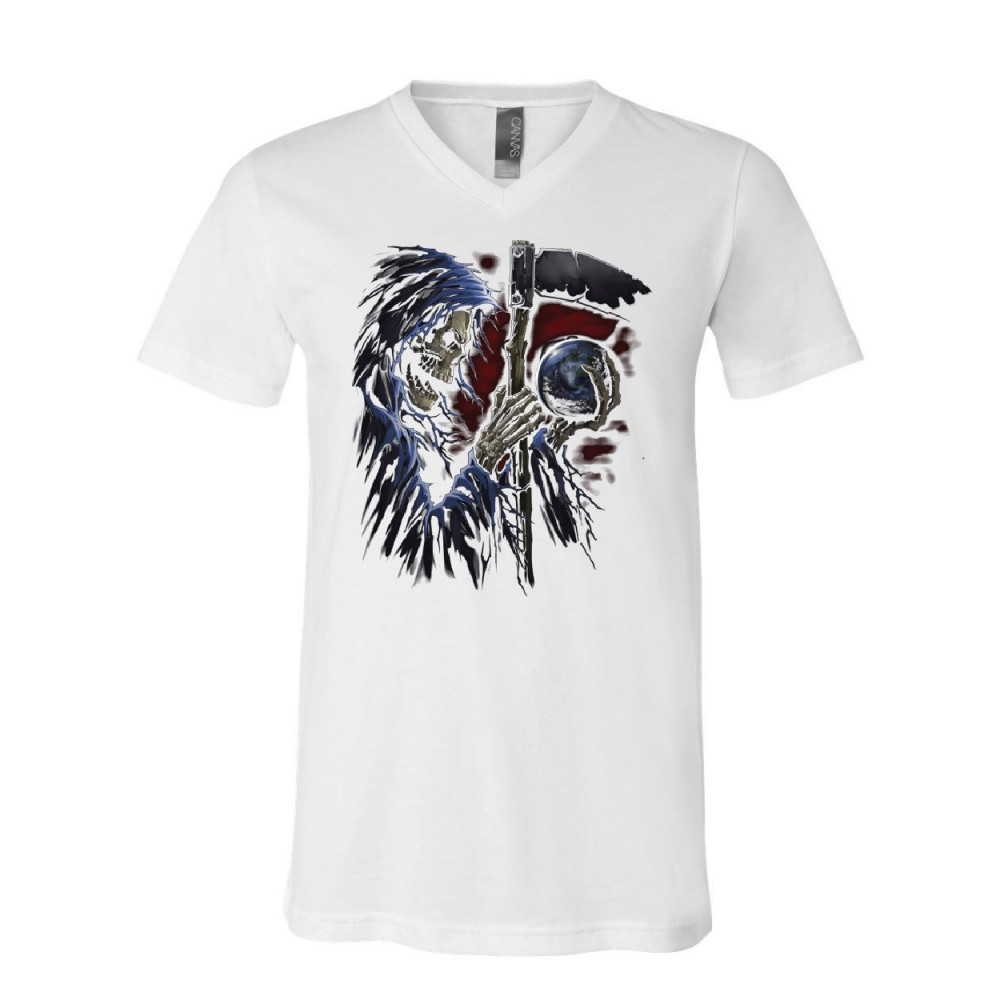 REAPER SPHERE SCYTHE v-neck t-shirt death skull creepy scary monster tee white