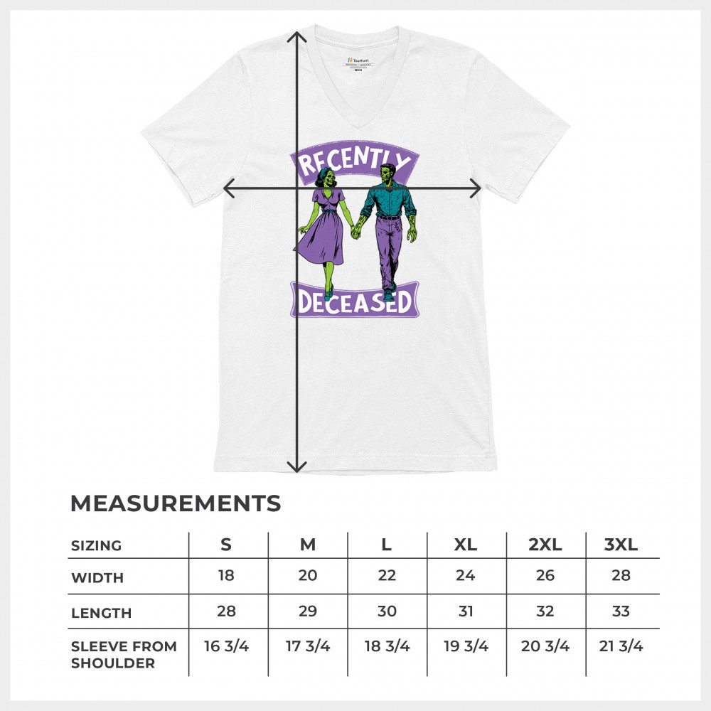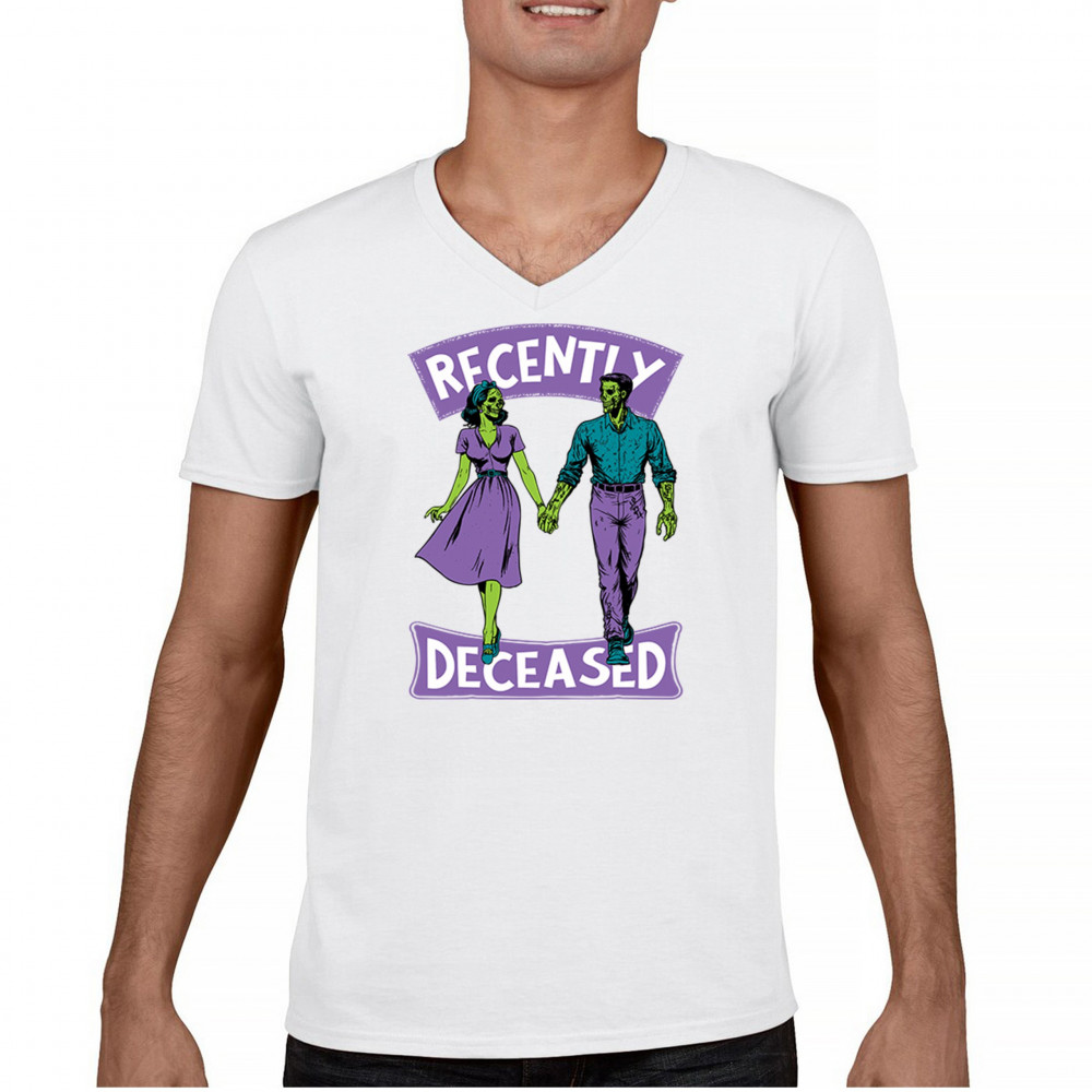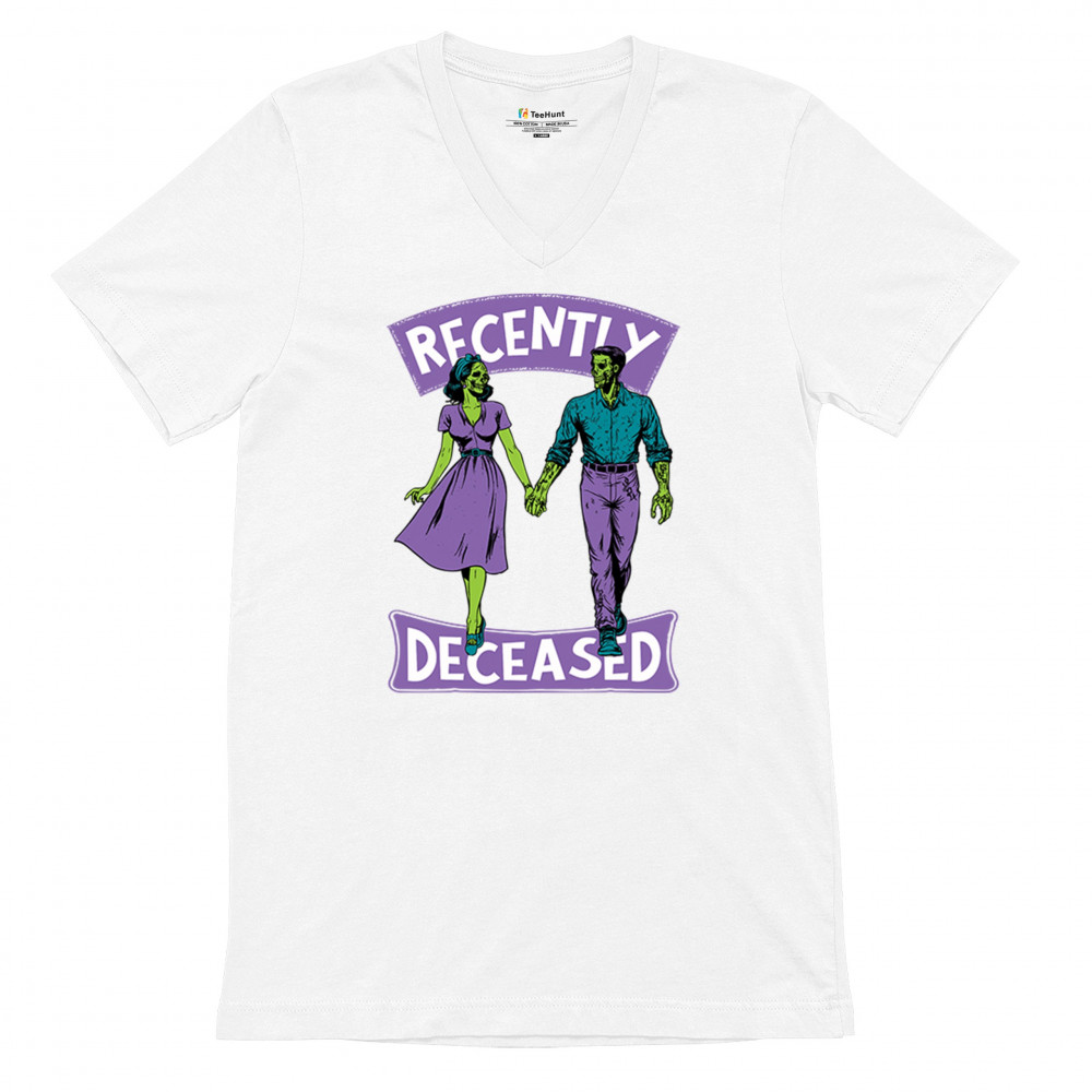 Recently Deceased zombie couple shirt with undead lovers design, spooky season humor, Halloween zombie outfit, and haunted house vibes.