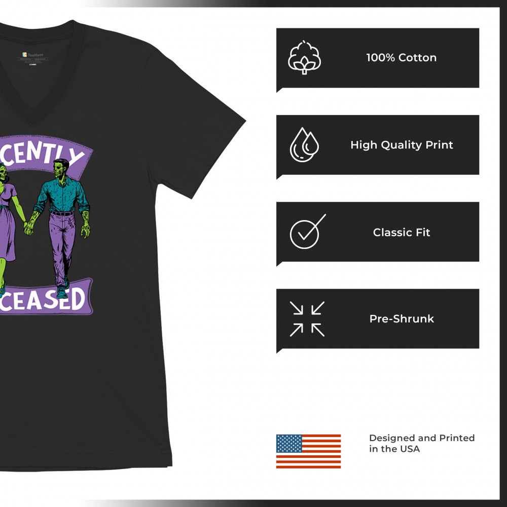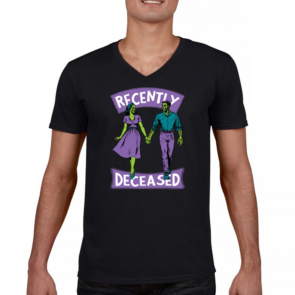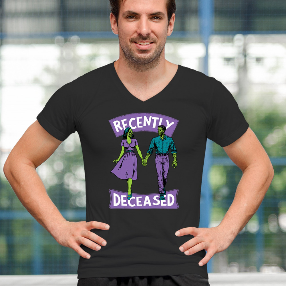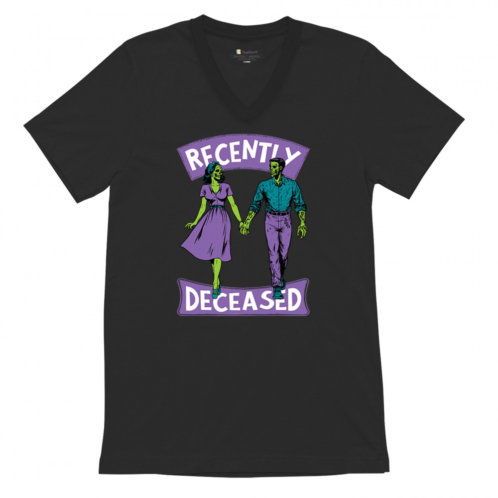 Recently Deceased zombie couple shirt with undead lovers design, spooky season humor, Halloween zombie outfit, and haunted house vibes.