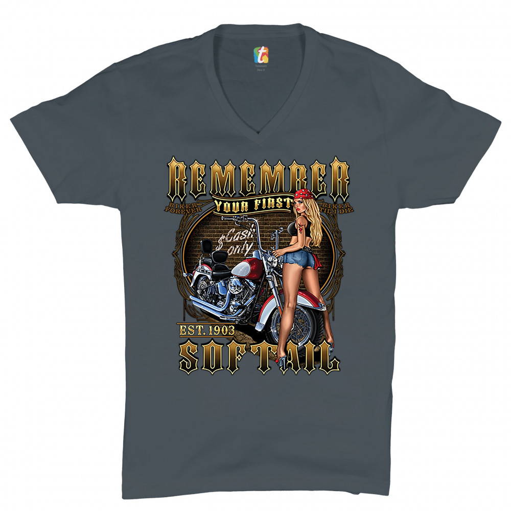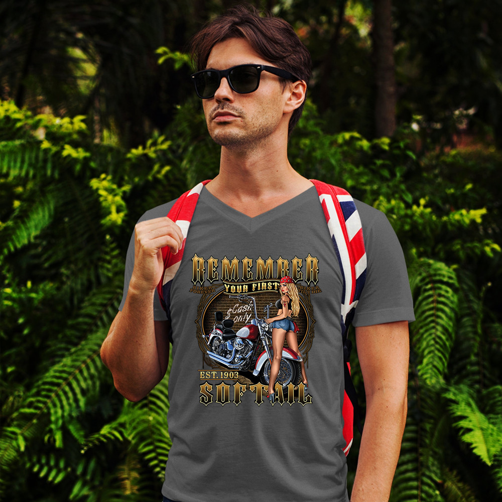 A print featuring a sexy pin-up girl in daisy dukes standing in front of a motorcycle. In the background there is a brick wall with "$ cash only" written on it. The print says: "Remember your first softail, biker forever, biker til i die, est. 1903". A gr
