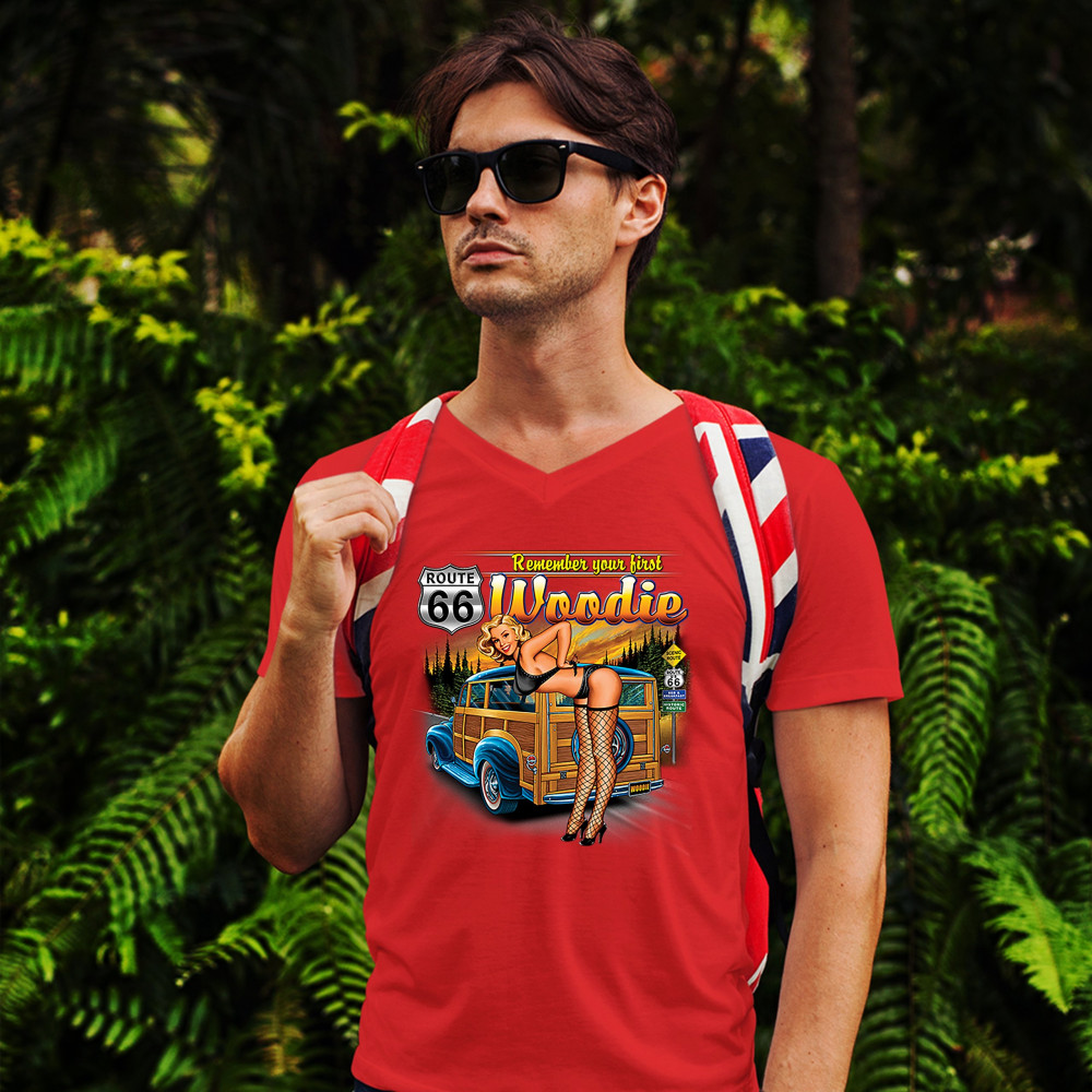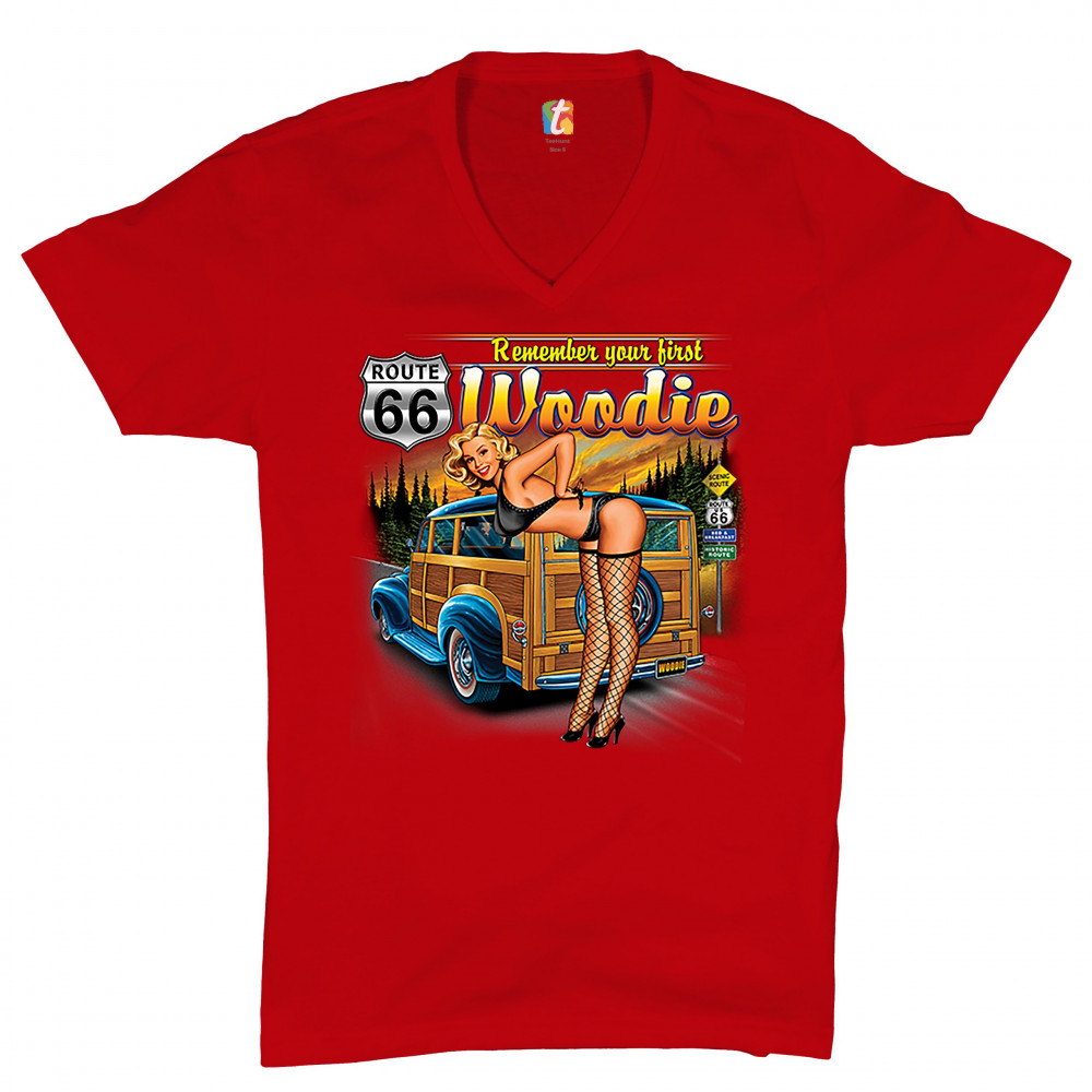 A print featuring a sexy blonde pin-up girl bending over and taking off her bra. Behind her there is a woodie wagon driving on a road. The print says: "Remeber your first woodie" and features a Route 66. A great choice for a fan of the legendary Mother Ro