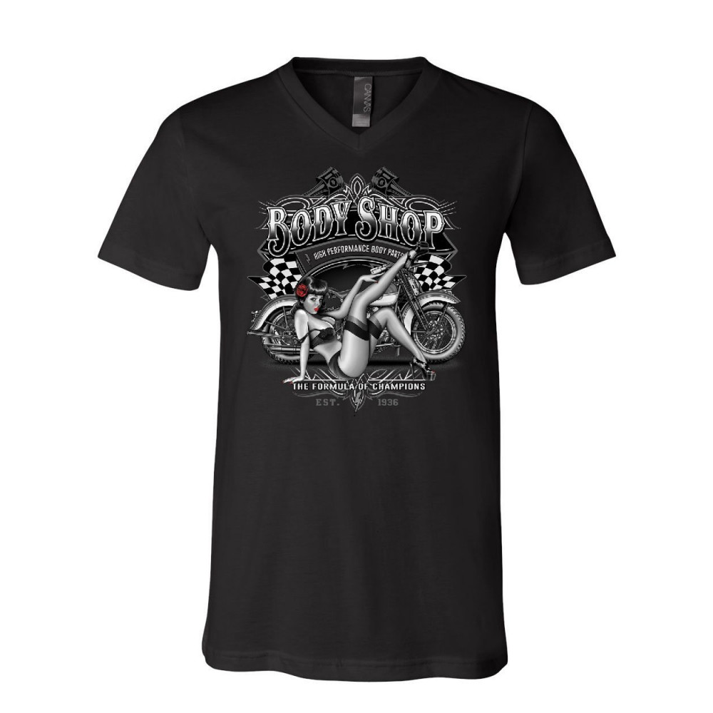 RETRO BODY SHOP v-neck t-shirt chopper sexy pin-up girl route 66 biker tee black