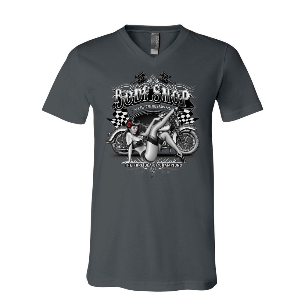 RETRO BODY SHOP v-neck t-shirt chopper sexy pin-up girl route 66 biker tee charcoal