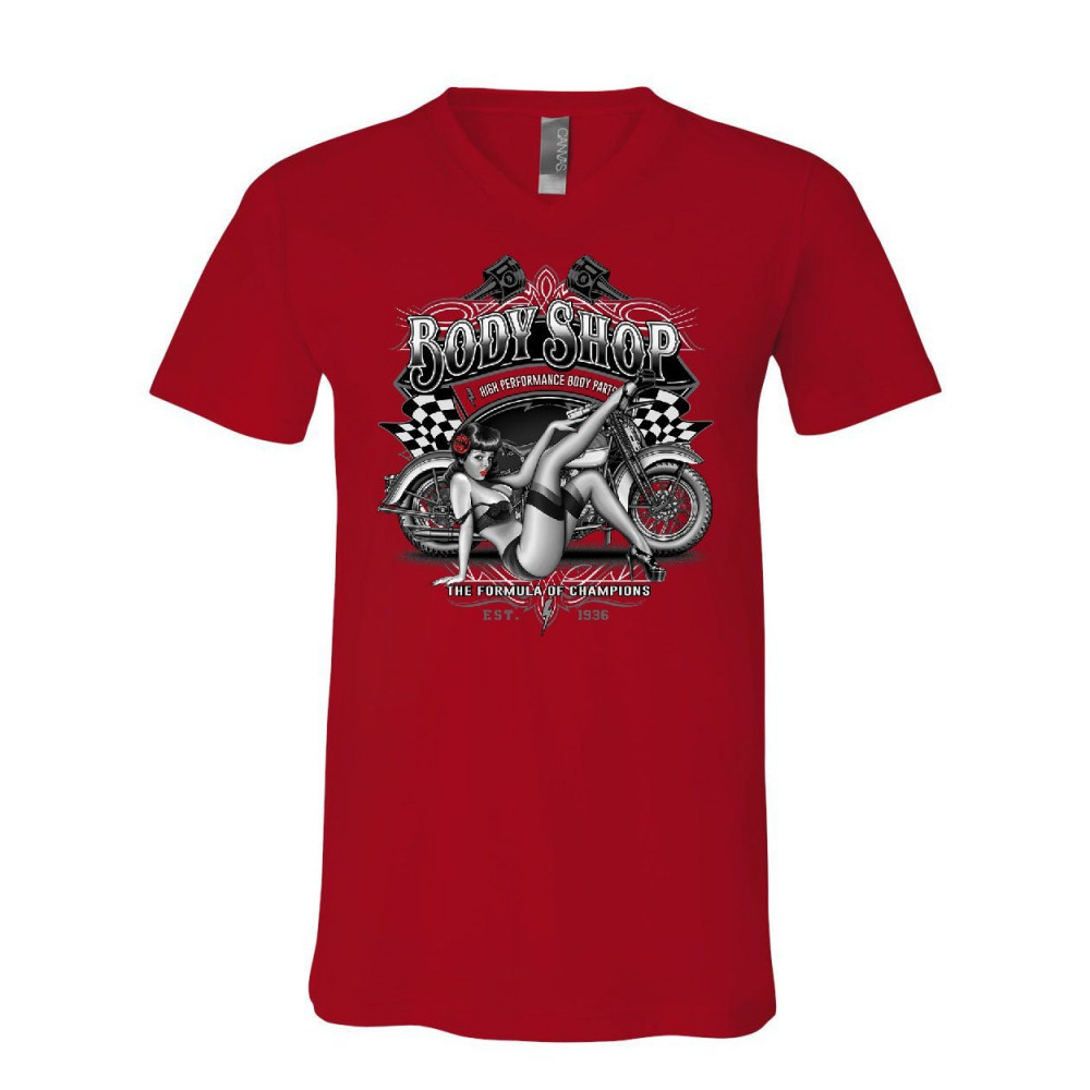 RETRO BODY SHOP v-neck t-shirt chopper sexy pin-up girl route 66 biker tee red