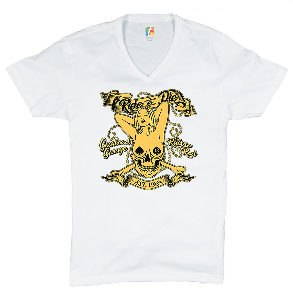A print featuring a naked woman with her hands behind her head and spades as nipple covers. Her body is mixed with a skull. There are crossed bones and multiple chains in the background. The print says: "Ride or Die, Gearhead Garage, Rust to Rod, Est. 196