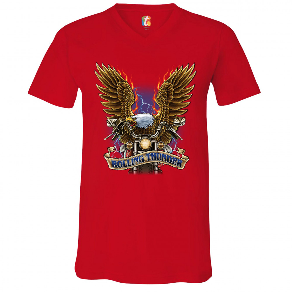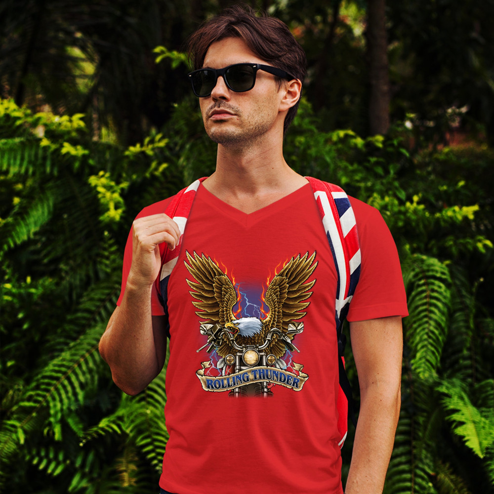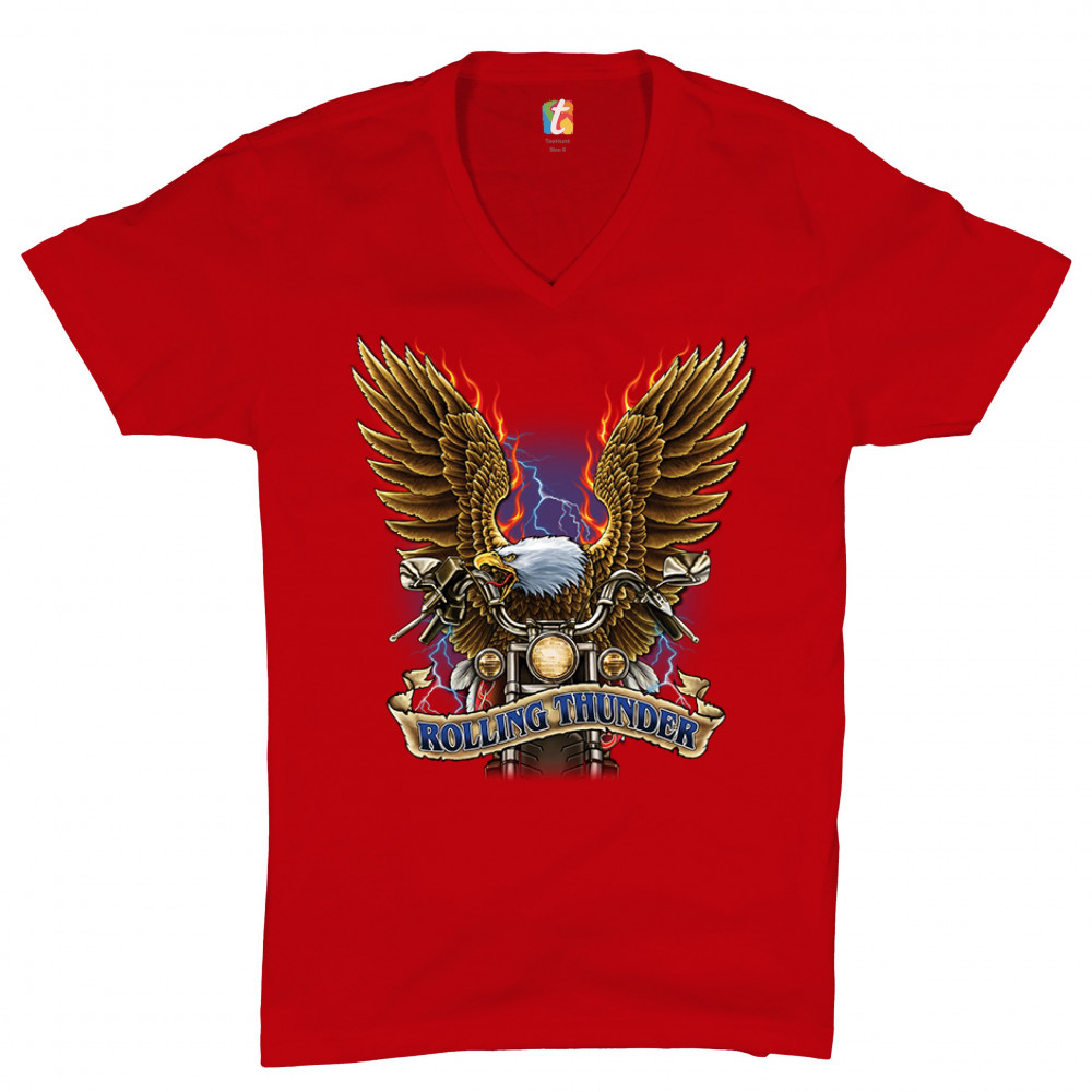 A print featuring an American bald eagle riding a motorcycle and spreading it's wings while they're on fire. In the background a lightning strikes. There is also stripe which says: "rolling thunder". A great choice for a motorcycle enthusiast.