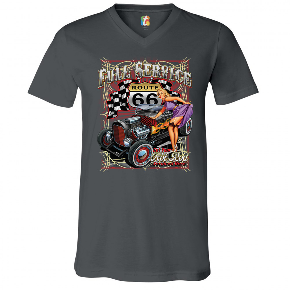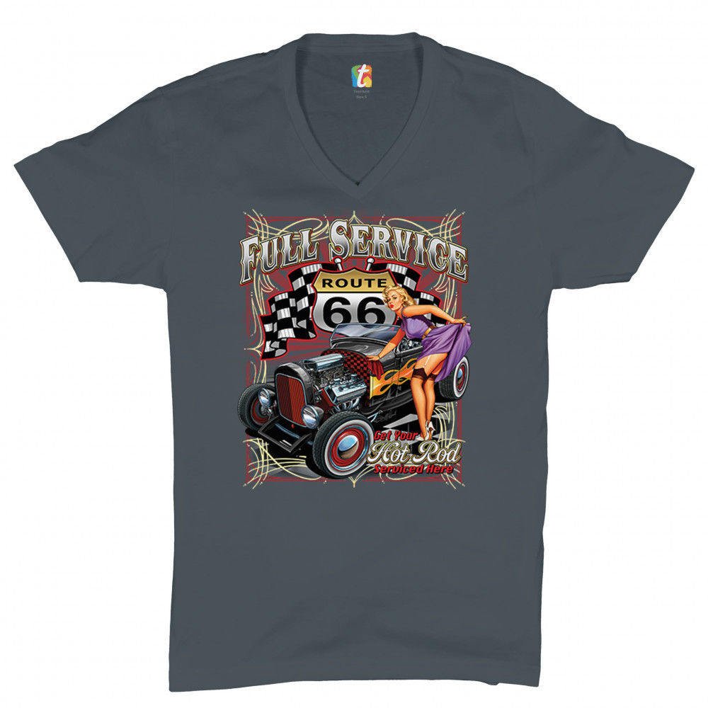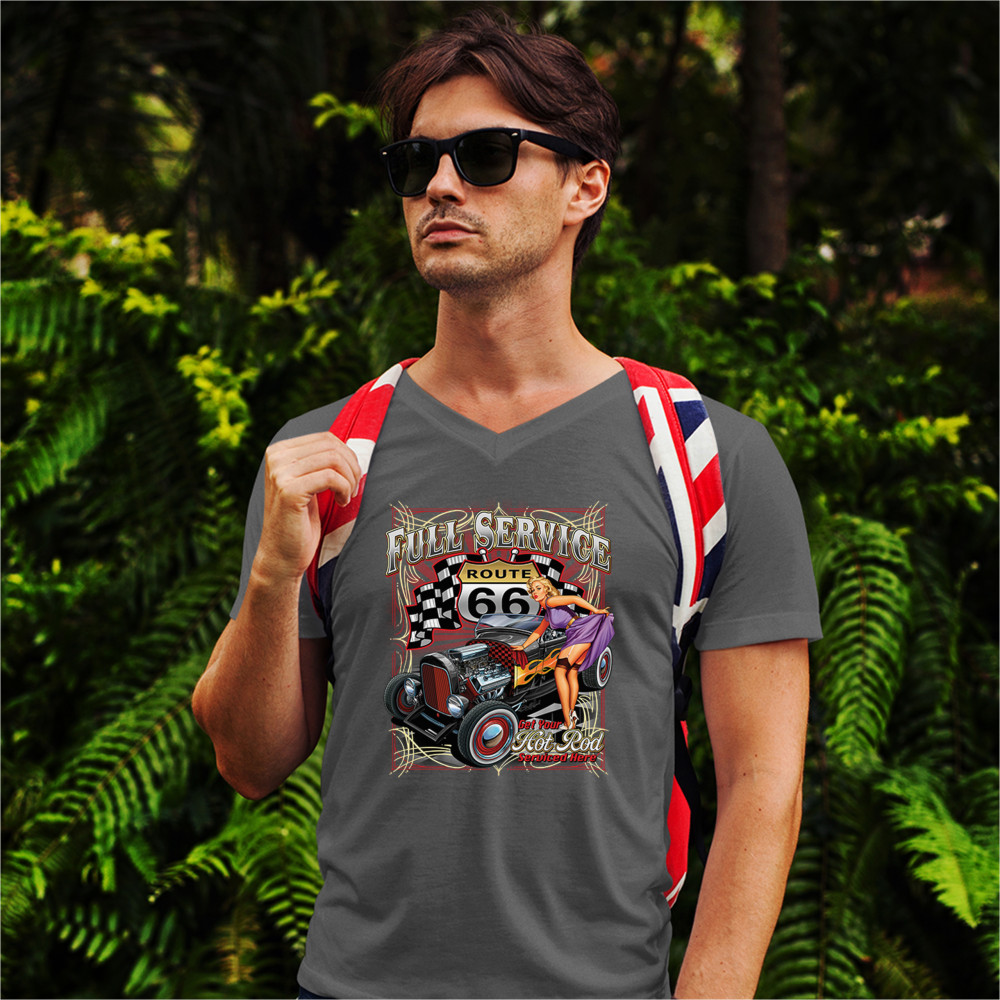 A print featuring a hot rod muscle car with flames painted on it's sides. There is a beautiful pin-up girl in stockings standing near it lifting her dress with one hand. The prints says: "full service" and "get your hot rod serviced here". In the background there is a Route 66 sign with racing flags to it's sides. Great for Route 66 and hot rod fans.