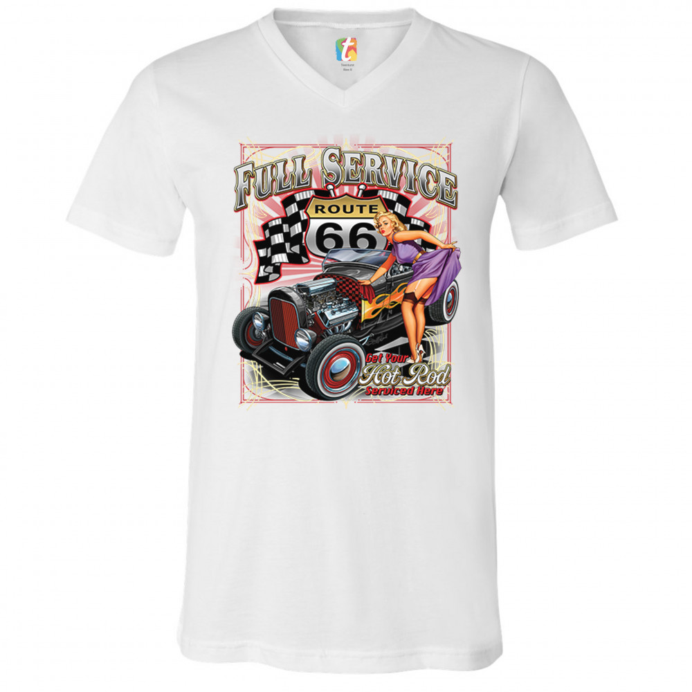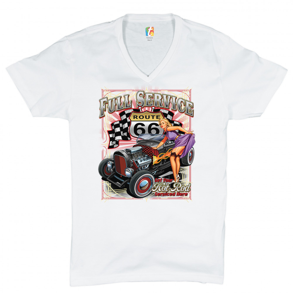 A print featuring a hot rod muscle car with flames painted on it's sides. There is a beautiful pin-up girl in stockings standing near it lifting her dress with one hand. The prints says: "full service" and "get your hot rod serviced here". In the background there is a Route 66 sign with racing flags to it's sides. Great for Route 66 and hot rod fans.