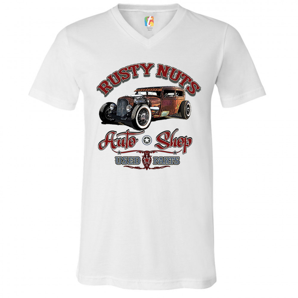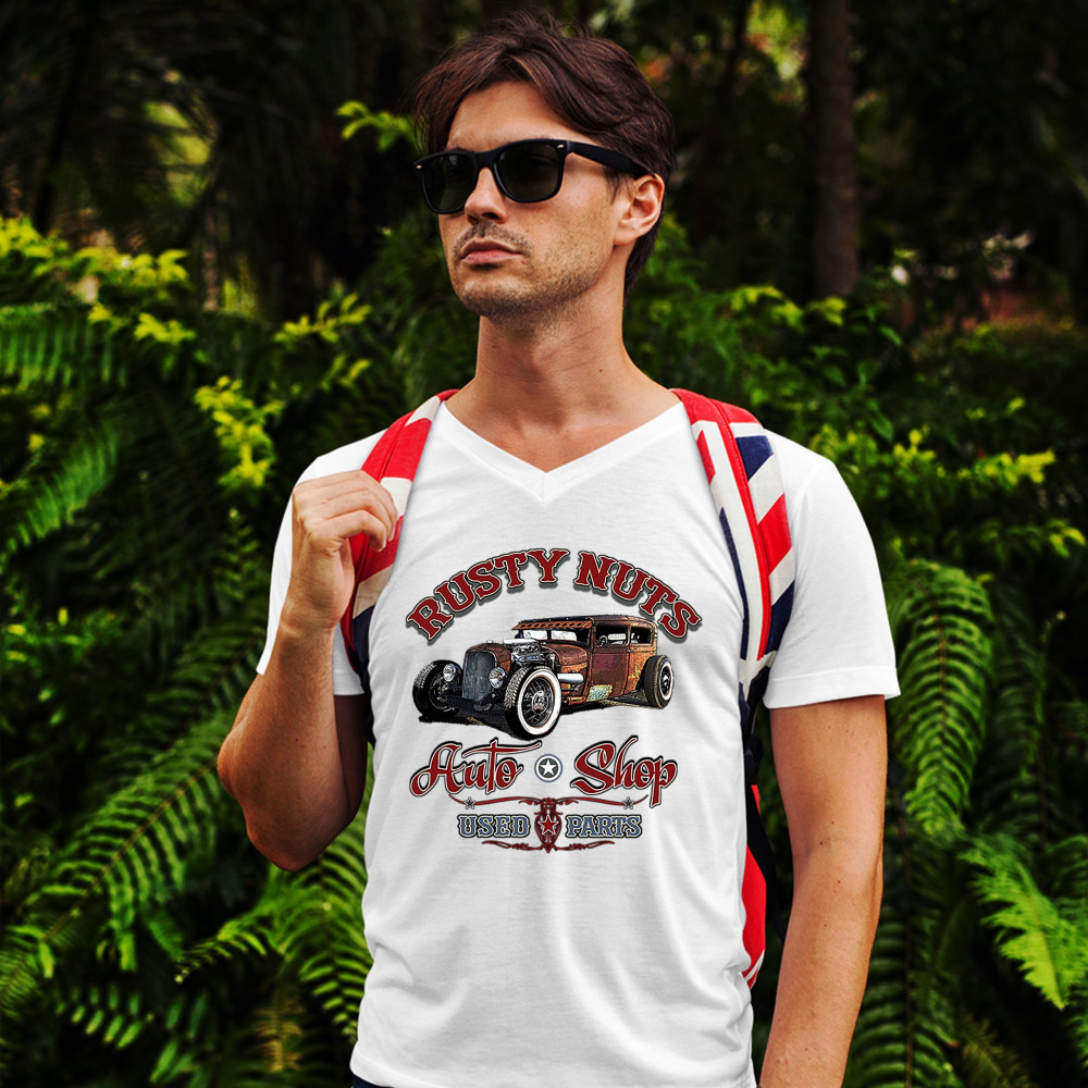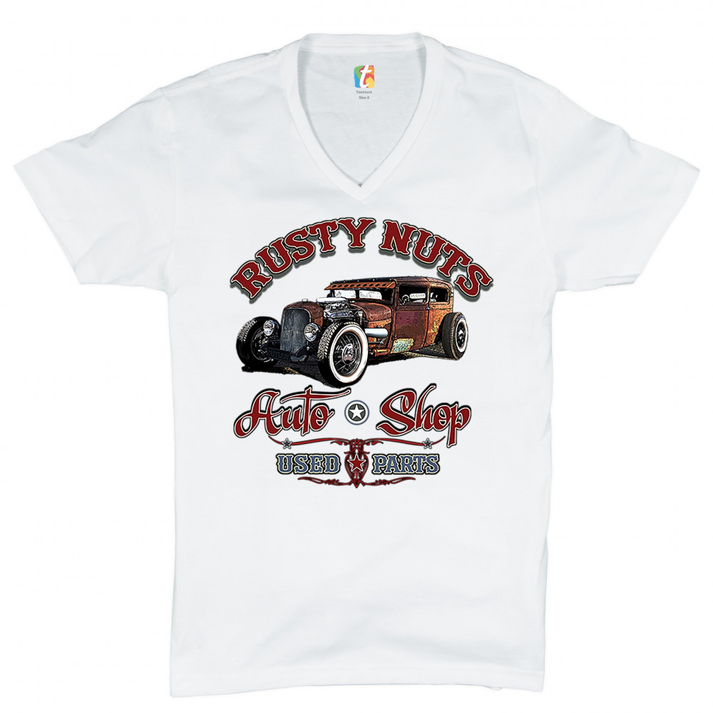 RUSTY NUTS AUTO SHOP v-neck t-shirt hot rod rat rod vintage old school tee white