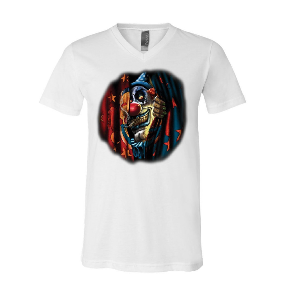 SCARY CIRCUS CLOWN v-neck t-shirt insane creepy clown evil mad horror tee white