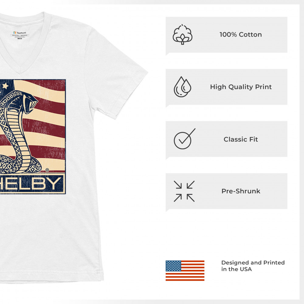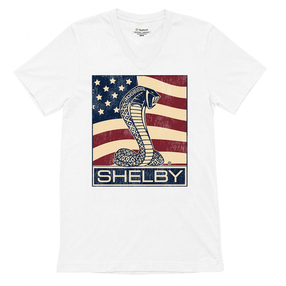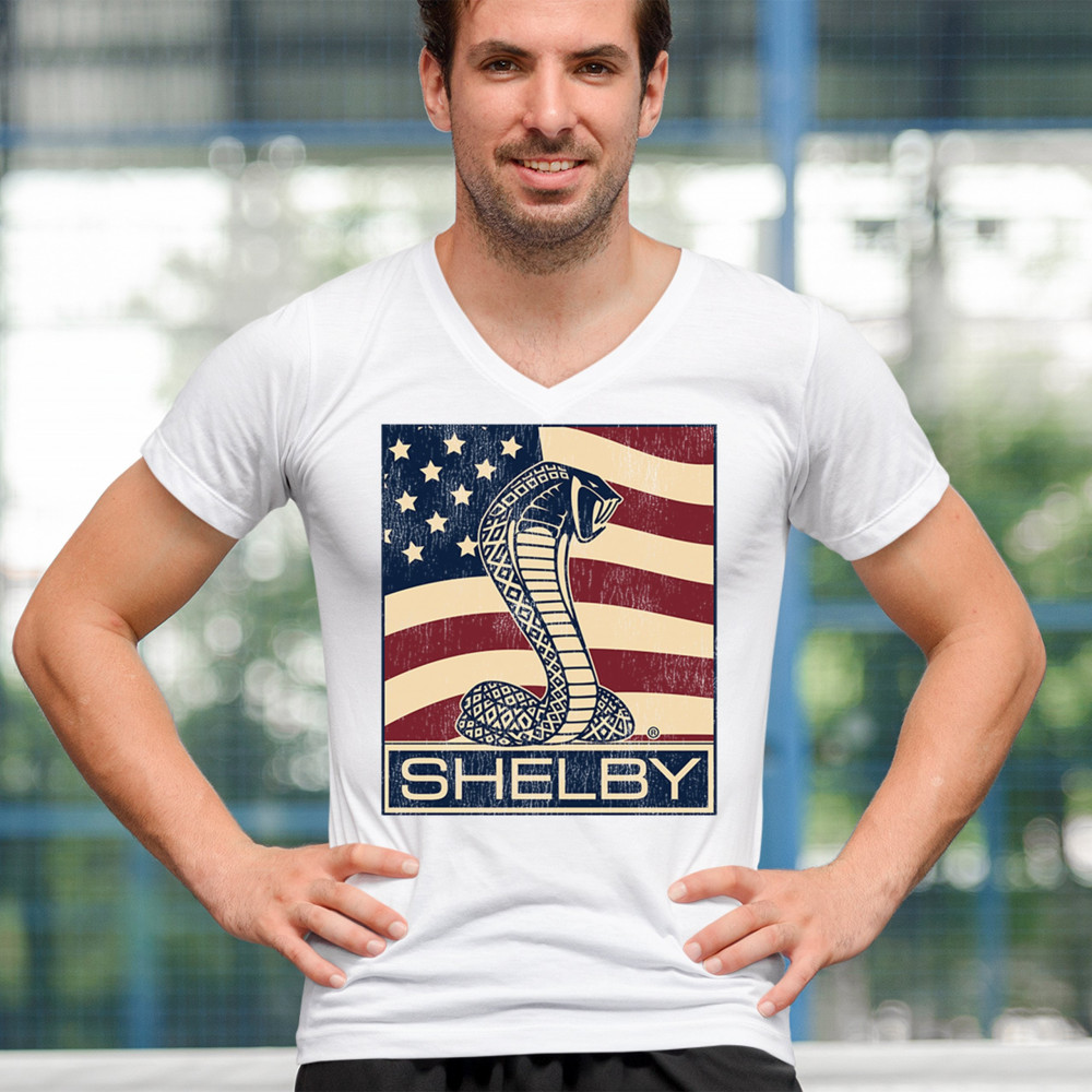 SHELBY COBRA FLAG v-neck t-shirt legend racing mustang gt powered by ford tee white