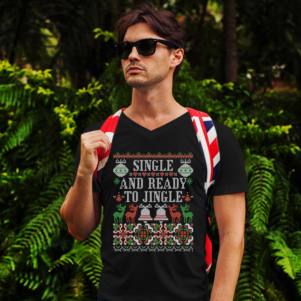 A print saying: "Single and Ready to Jingle" and featuring four reindeers and two Christmas bells. The print is designed as an ugly sweater. Amazing choice for a single person who wants to make people smile and spread positive vibes on Christmas Eve.