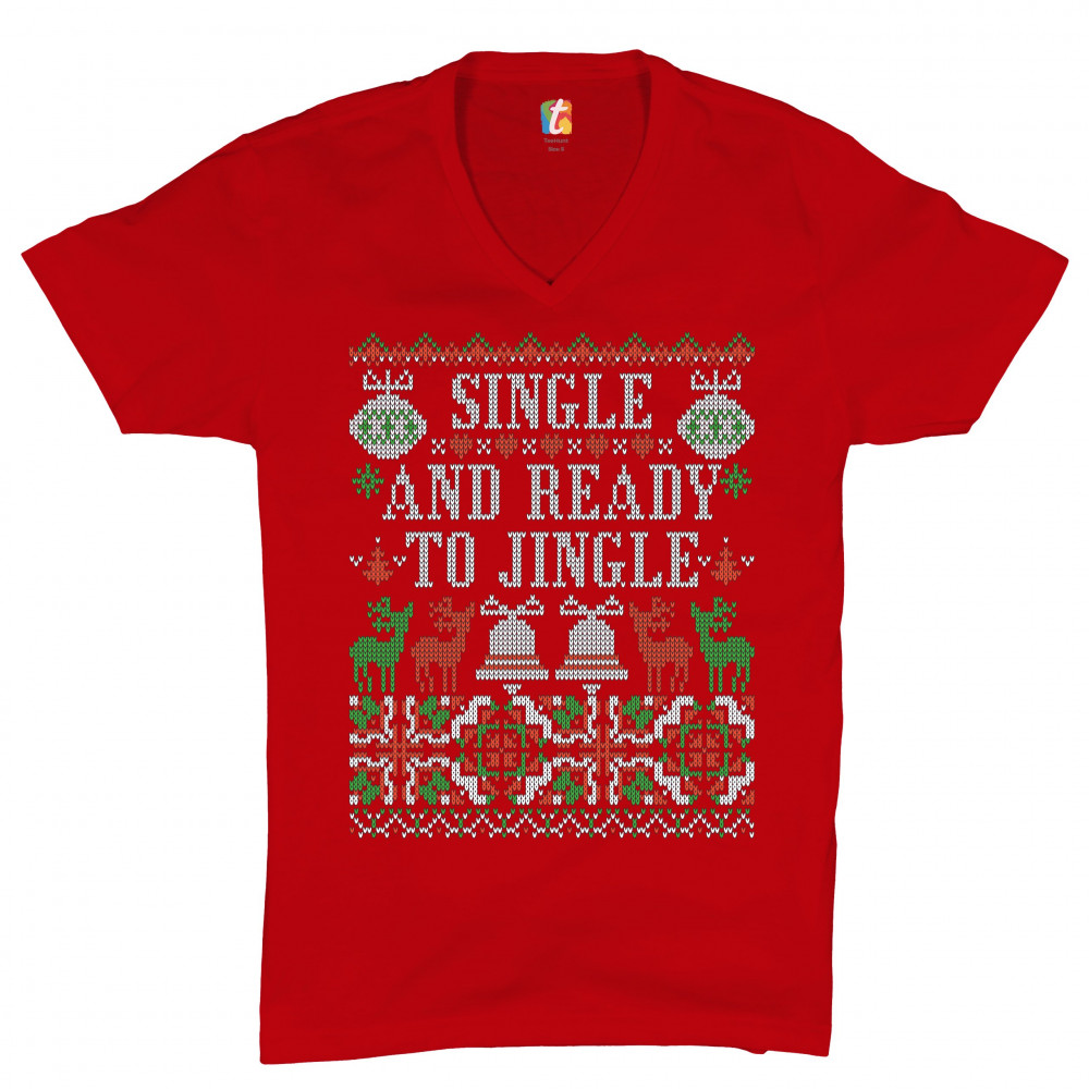 A print saying: "Single and Ready to Jingle" and featuring four reindeers and two Christmas bells. The print is designed as an ugly sweater. Amazing choice for a single person who wants to make people smile and spread positive vibes on Christmas Eve.