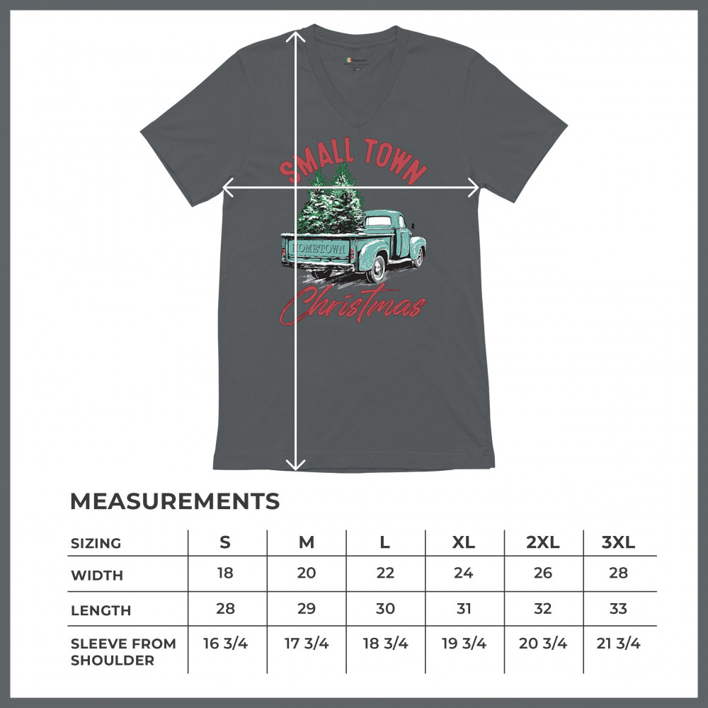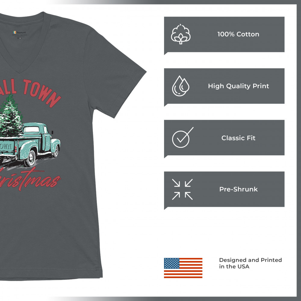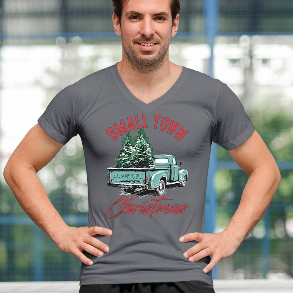 Embrace holiday nostalgia with this "Small Town Christmas" design featuring a vintage truck and Christmas trees. Perfect for rustic decor lovers.