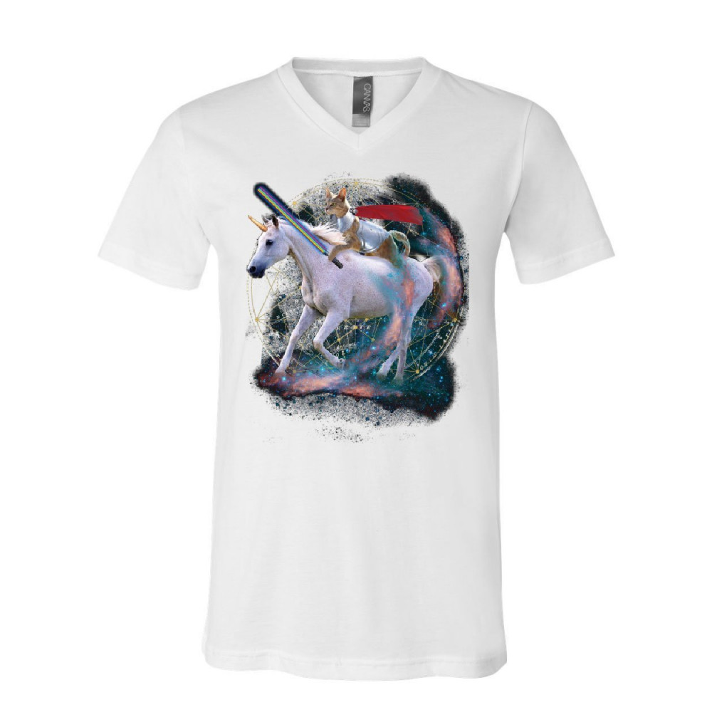 SPACE CAT RIDING A UNICORN with a saber v-neck t-shirt weird universe tee white