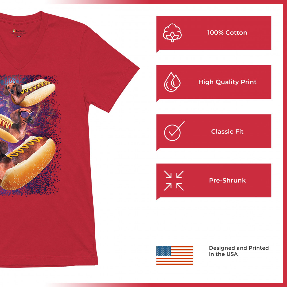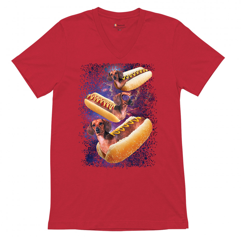 Quirky and fun tee featuring dachshunds as hotdogs in a cosmic setting. Perfect for dog and space lovers. Comfortable and durable.