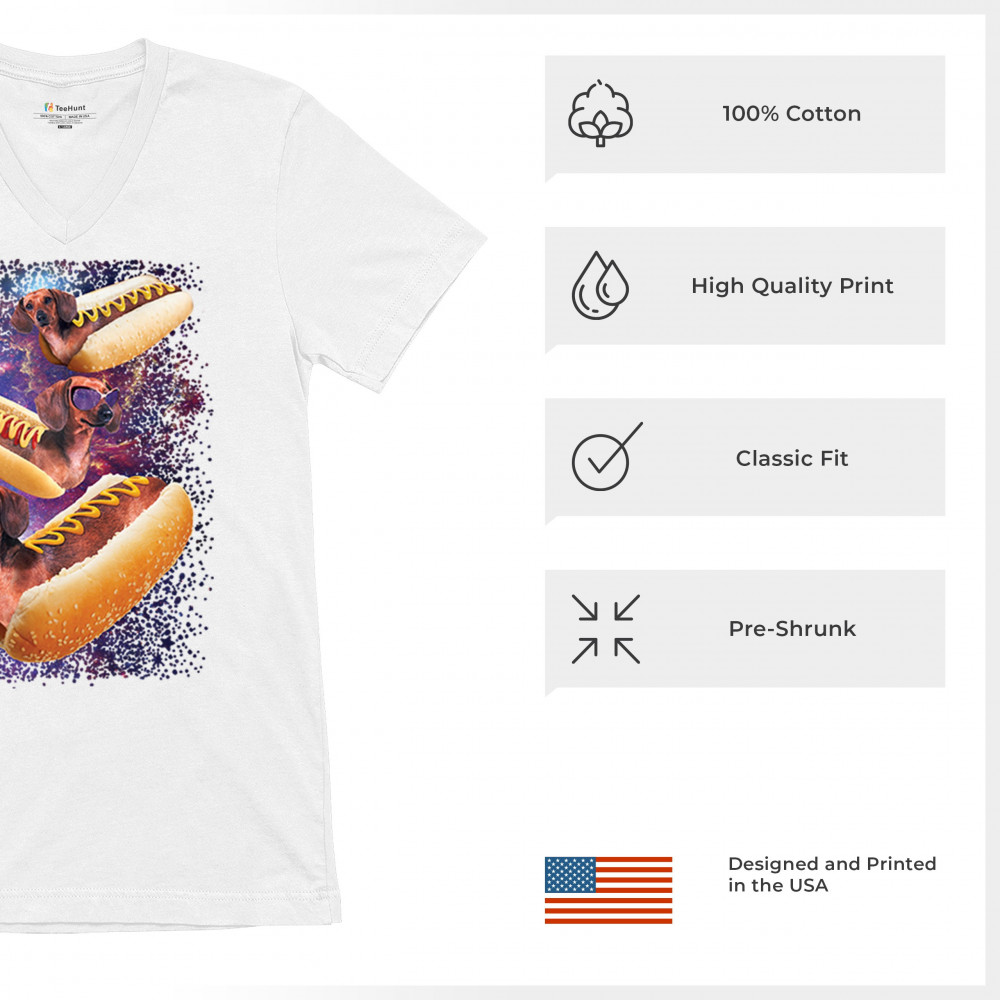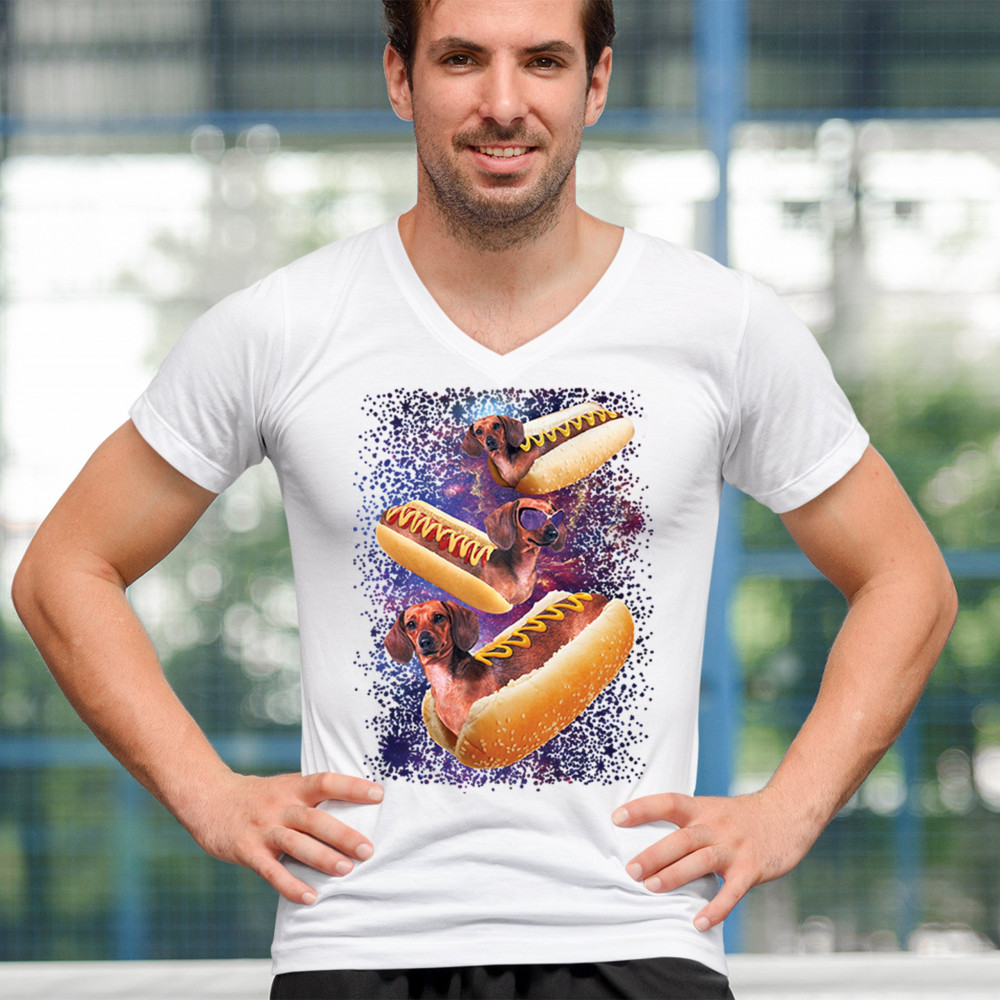 Add a dash of humor to your wardrobe with our unique design featuring adorable dachshunds as hotdogs in a cosmic setting. This playful graphic is perfect for animal lovers and those with a quirky sense of style. The vibrant colors and detailed illustration ensure you stand out in any crowd. Made from premium materials, this tee offers both comfort and durability, making it ideal for everyday wear or special occasions. Embrace your love for dogs and space with this fun and imaginative design.