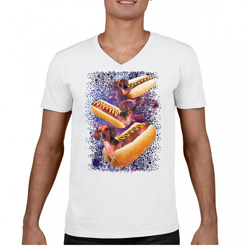 Quirky and fun tee featuring dachshunds as hotdogs in a cosmic setting. Perfect for dog and space lovers. Comfortable and durable.