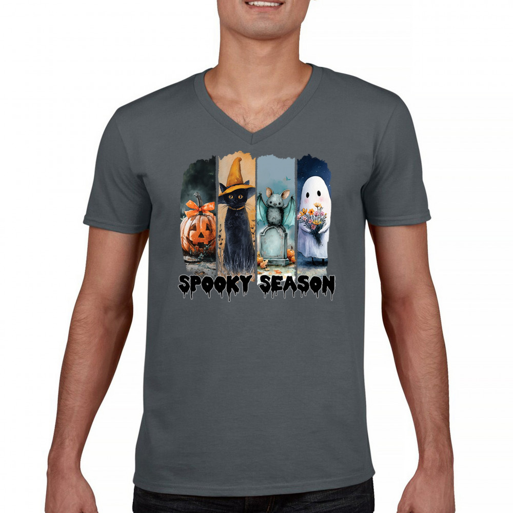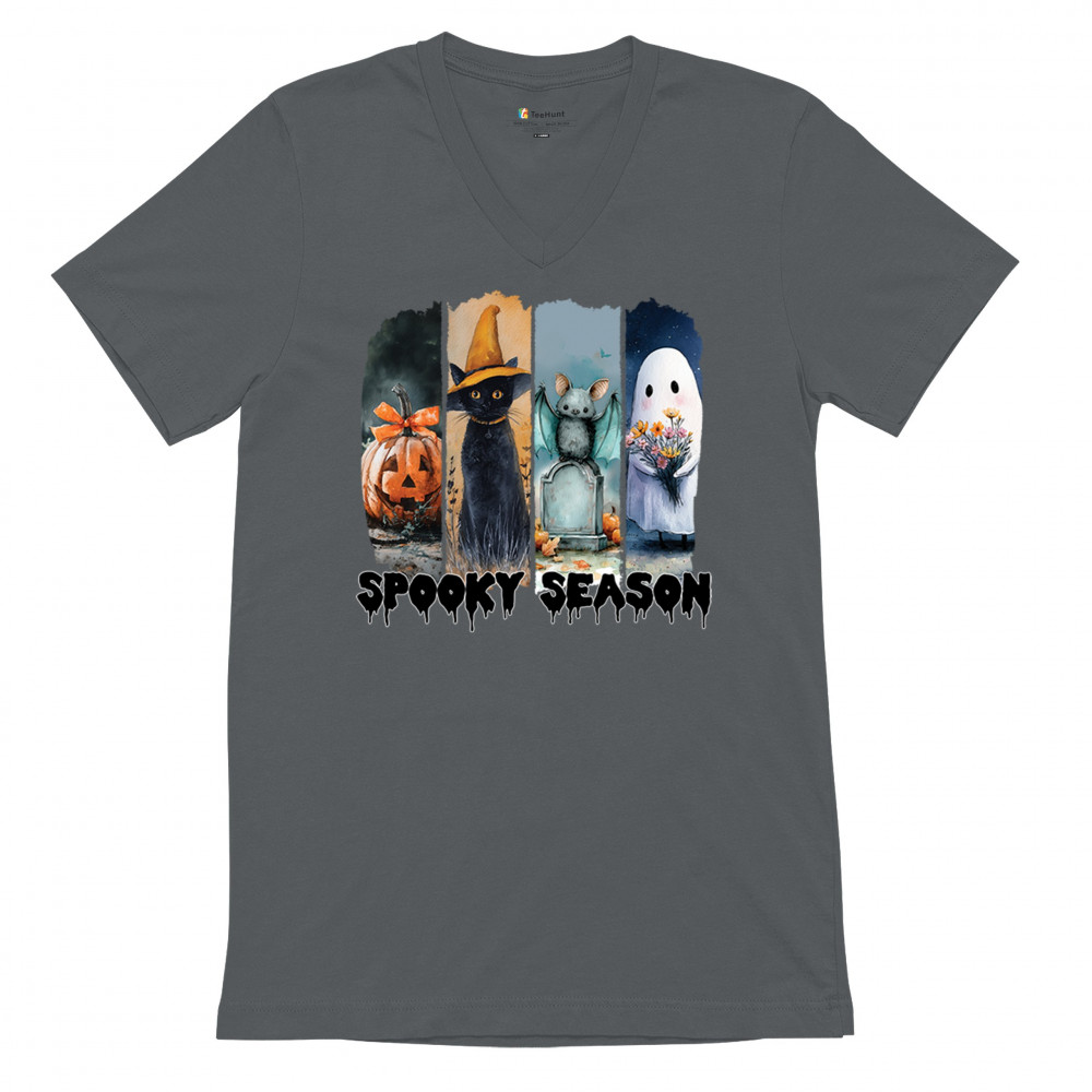 Spooky Season design with scary black cat, jack o lantern, haunted ghost house, and cute ghost. Perfect for October 31, trick or treat, and fall fun.