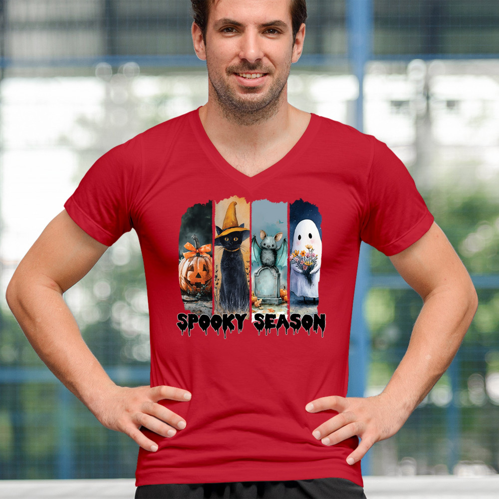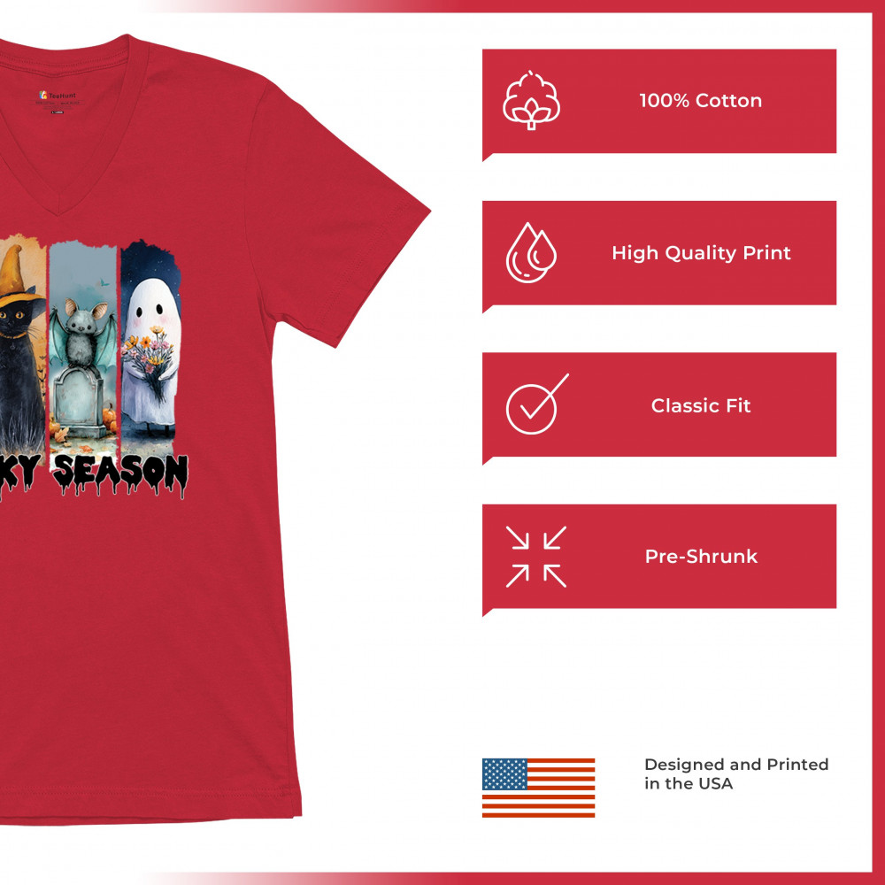 Spooky Season design with scary black cat, jack o lantern, haunted ghost house, and cute ghost. Perfect for October 31, trick or treat, and fall fun.