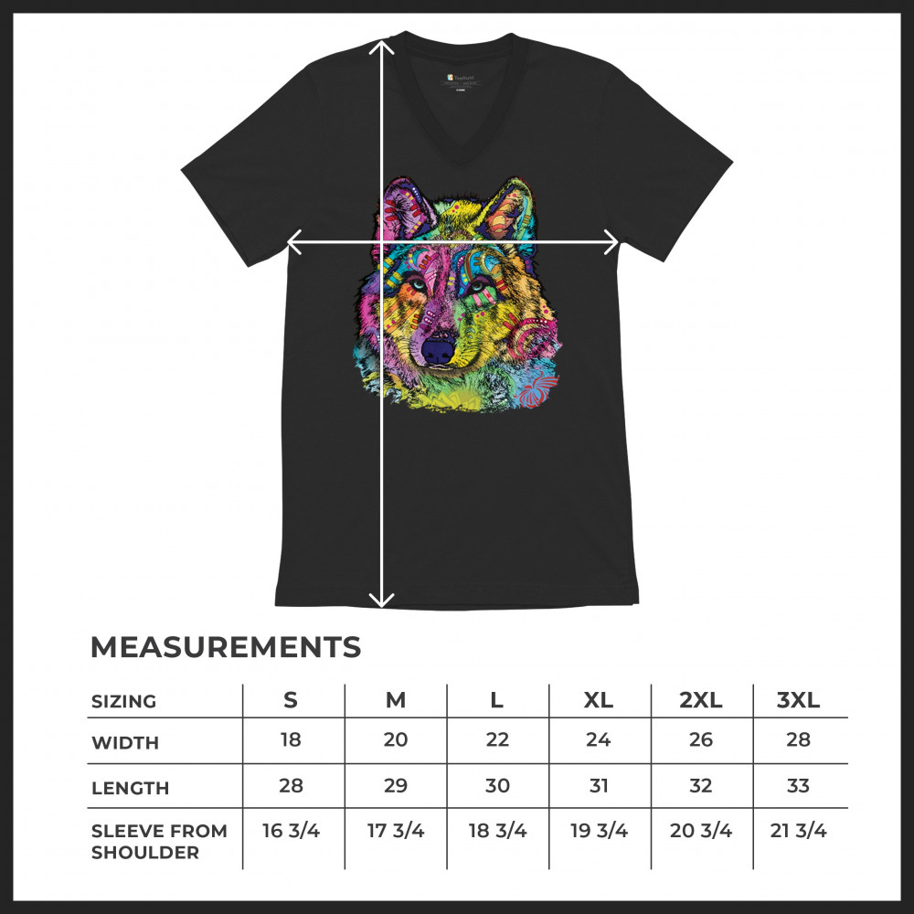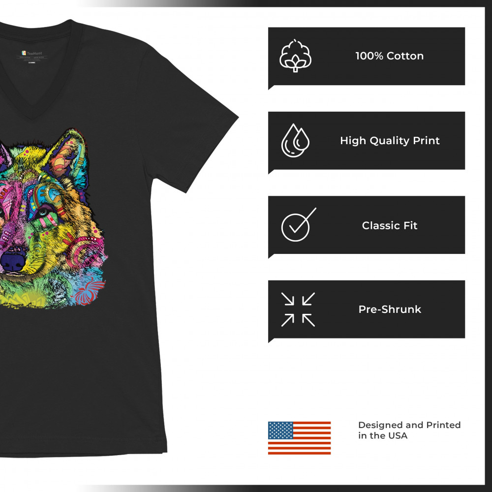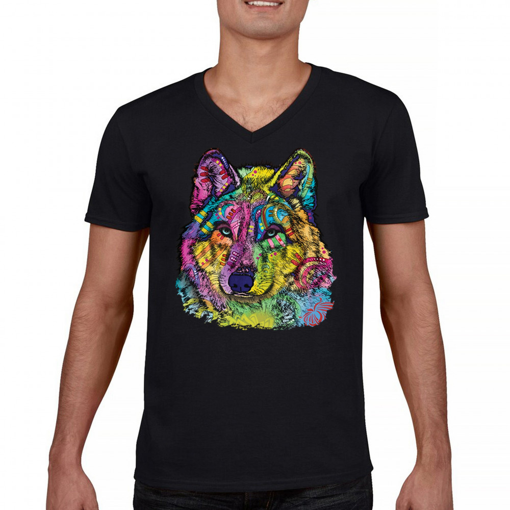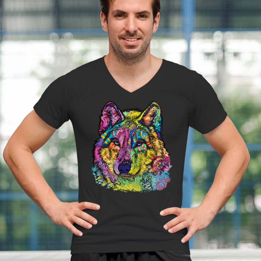 STARE OF THE WOLF v-neck t-shirt dean russo colorful neon animal art tee black