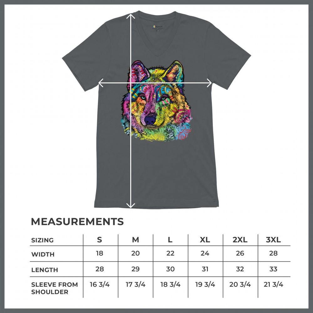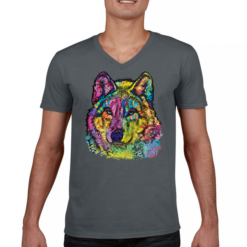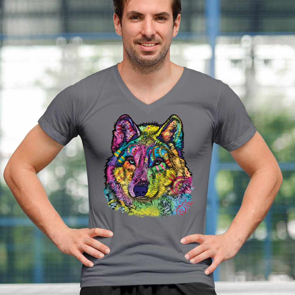 STARE OF THE WOLF v-neck t-shirt dean russo colorful neon animal art tee charcoal