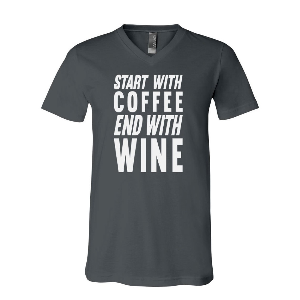 START WITH COFFEE END WITH WINE v-neck t-shirt drinking daily routine tee charcoal