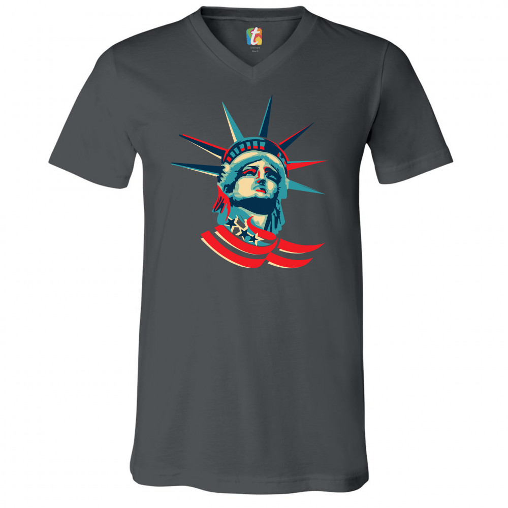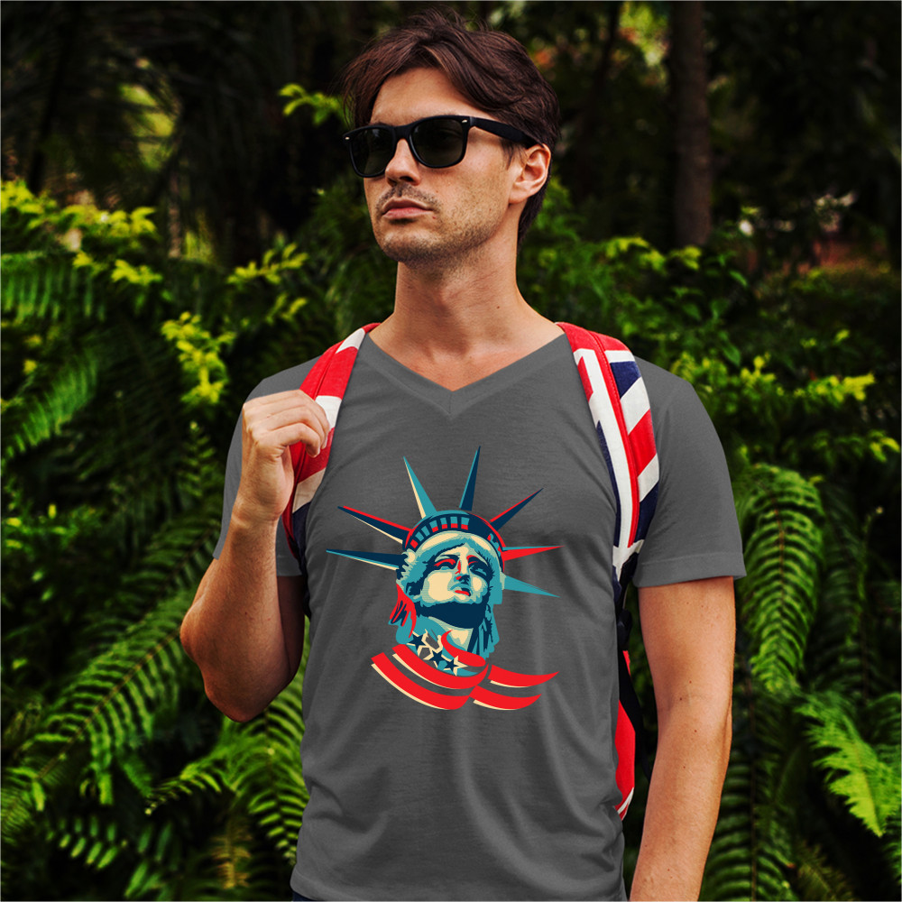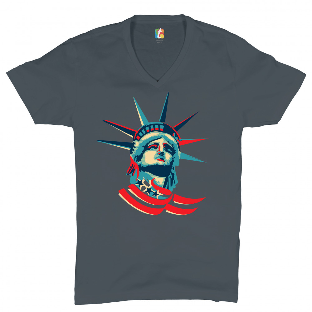 A patriotic print featuring a dripping silhouette of a bald eagle. The body is painted blue with lots of stars on it and the feathers of the wings, painted red, resemble the stripes of the American Flag. Over the wings there is a text written: "Land of the free home of the brave". Great choice to wear on Independence Day or any other patriotic holiday.