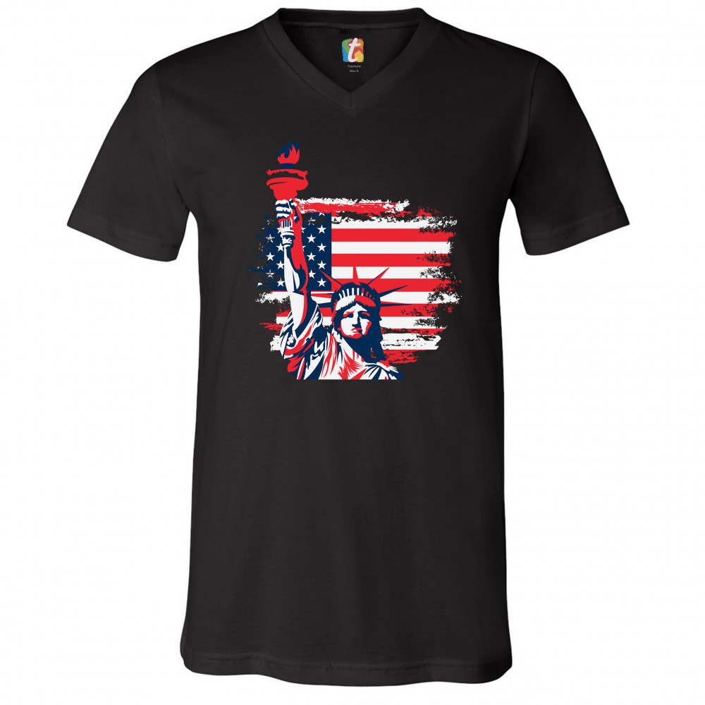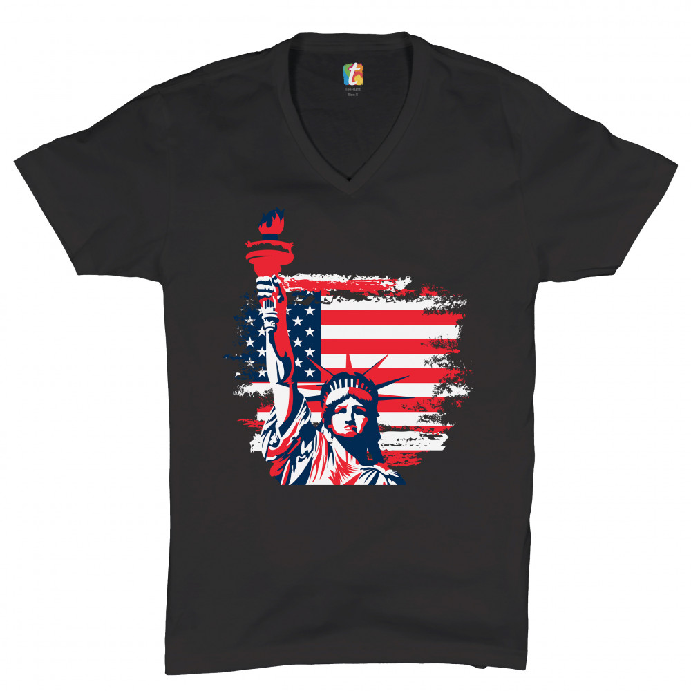 A patriotic print featuring a dripping silhouette of a bald eagle. The body is painted blue with lots of stars on it and the feathers of the wings, painted red, resemble the stripes of the American Flag. Over the wings there is a text written: "Land of the free home of the brave". Great choice to wear on Independence Day or any other patriotic holiday.