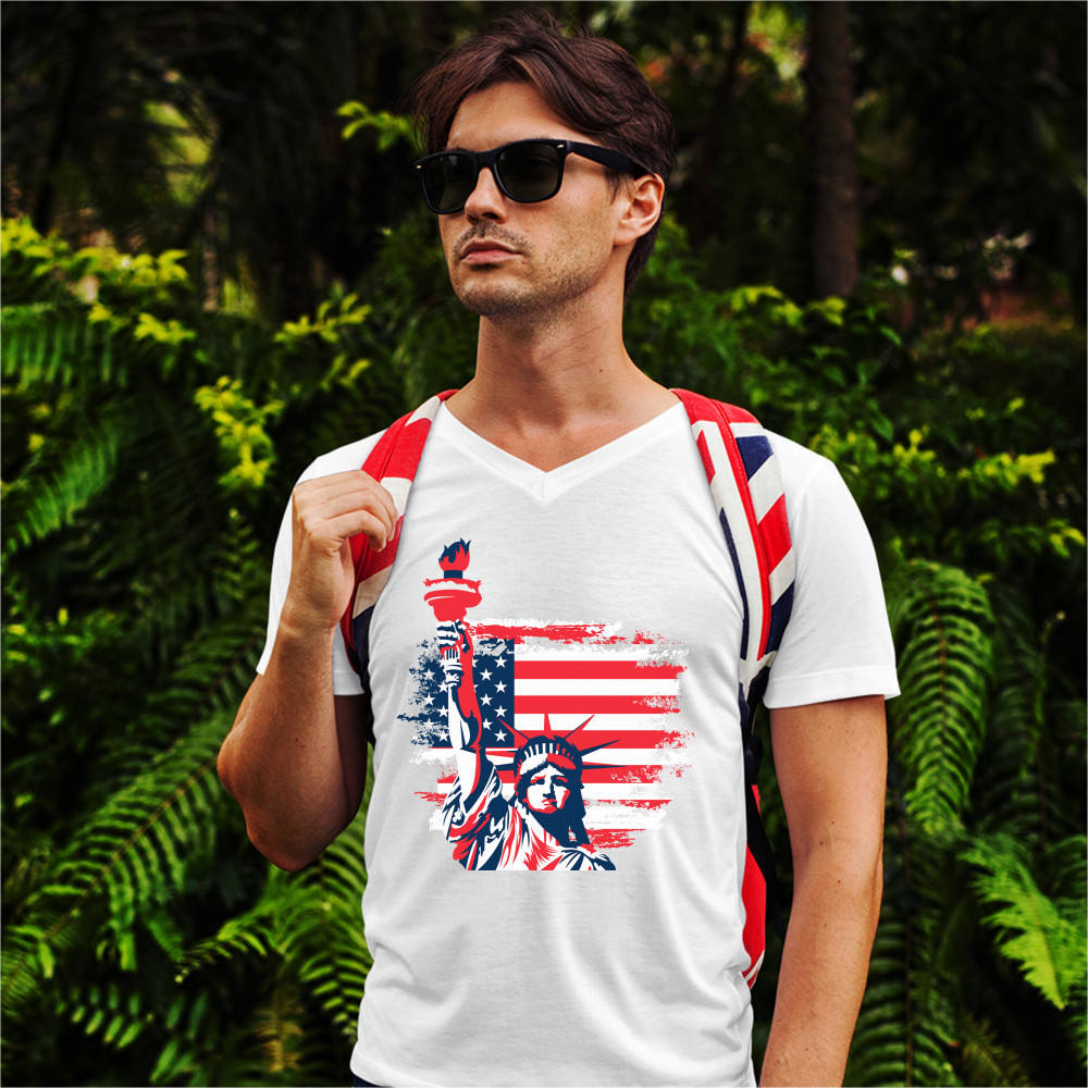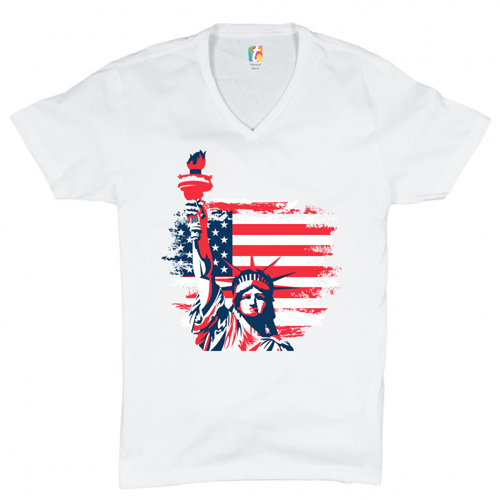 A patriotic print featuring a dripping silhouette of a bald eagle. The body is painted blue with lots of stars on it and the feathers of the wings, painted red, resemble the stripes of the American Flag. Over the wings there is a text written: "Land of the free home of the brave". Great choice to wear on Independence Day or any other patriotic holiday.
