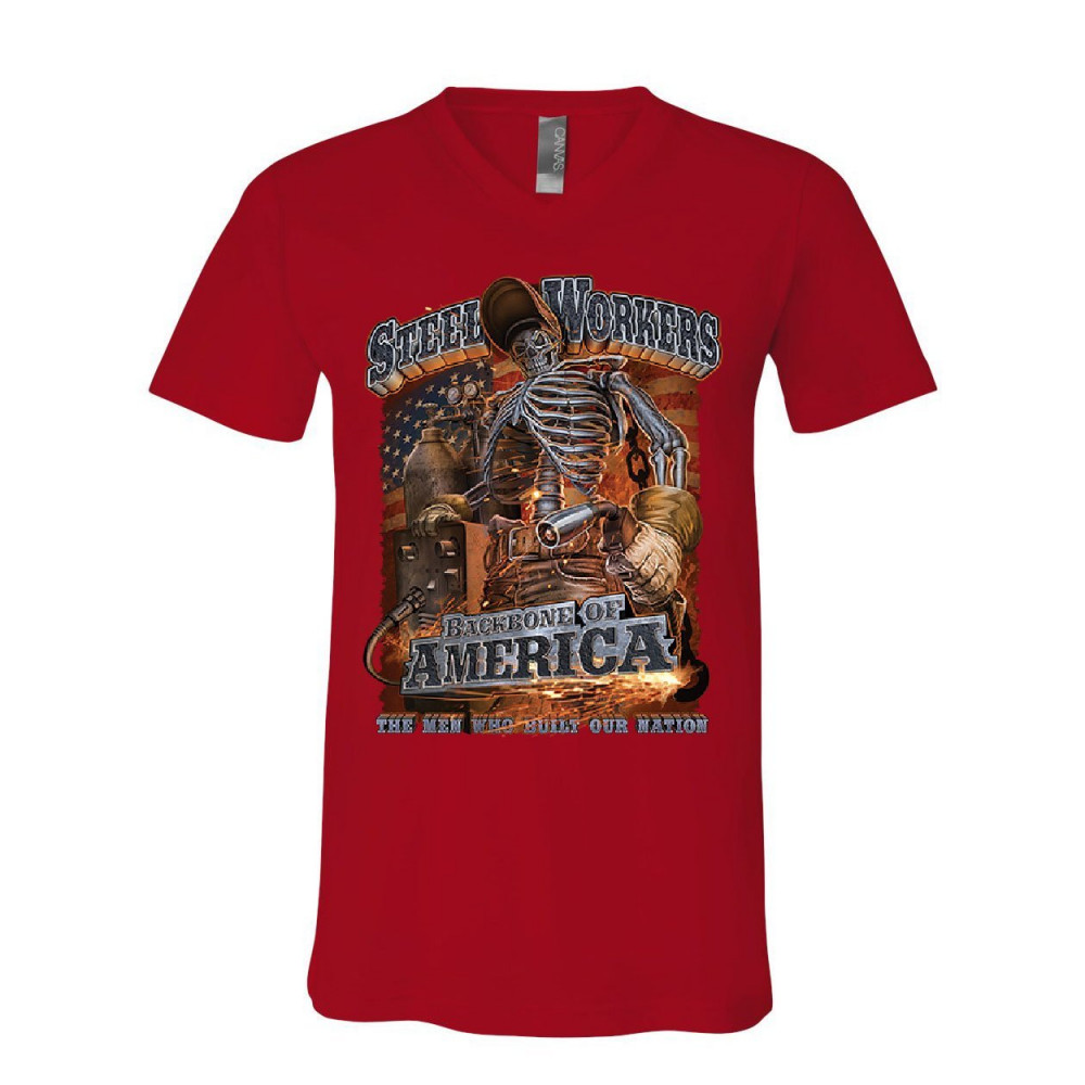 STEELWORKERS - BACKBONE OF AMERICA steel workers backbone of america v-neck t-shirt welding iron metal tee red