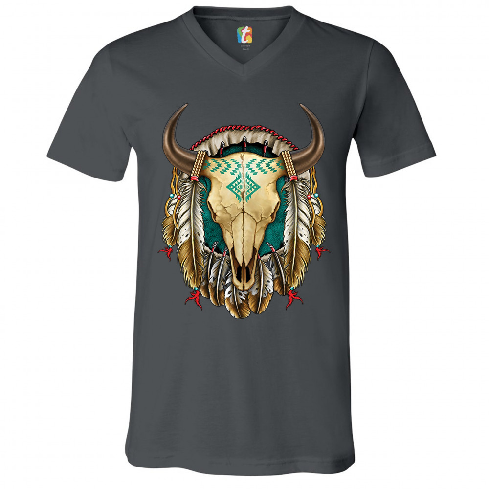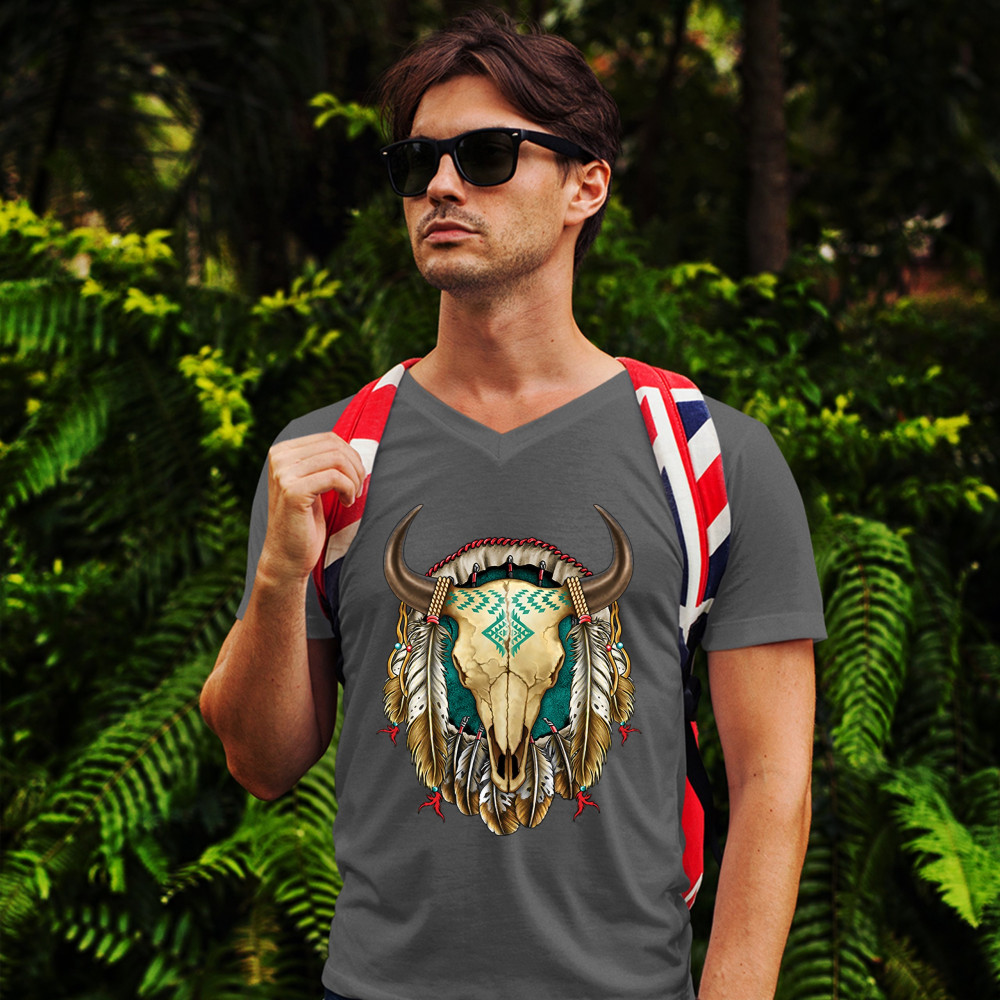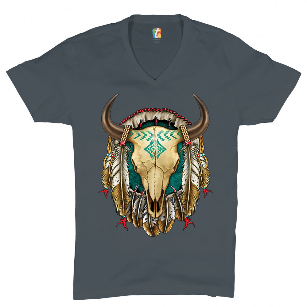 STEER SKULL DREAMCATCHER v-neck t-shirt native american indigenous culture tee charcoal