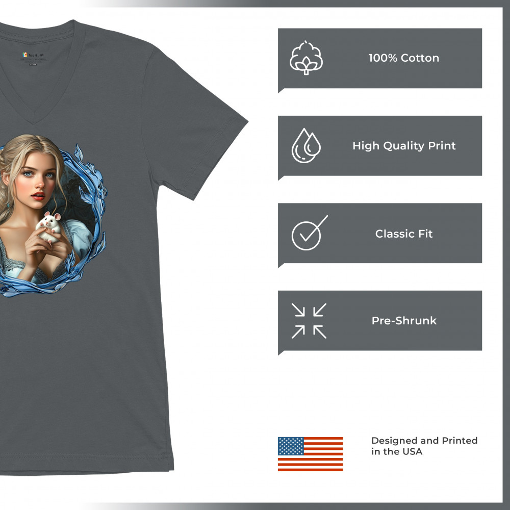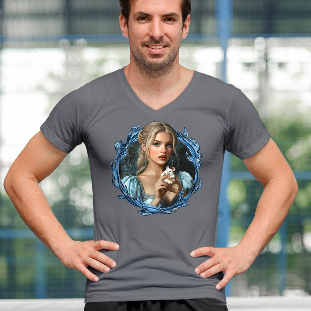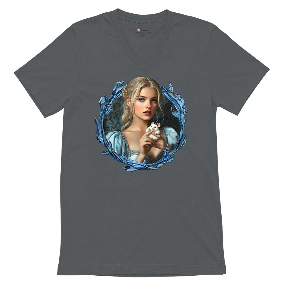 A whimsical design inspired by fairytales and Cinderella magic, featuring a blonde girl in a blue dress holding a white mouse. The icy blue leaf frame evokes enchantment and transformation. With soft, vintage tones and a dreamy feel, it’s a charming tribute to kindness, fantasy, animal companionship, and gentle storytelling magic.