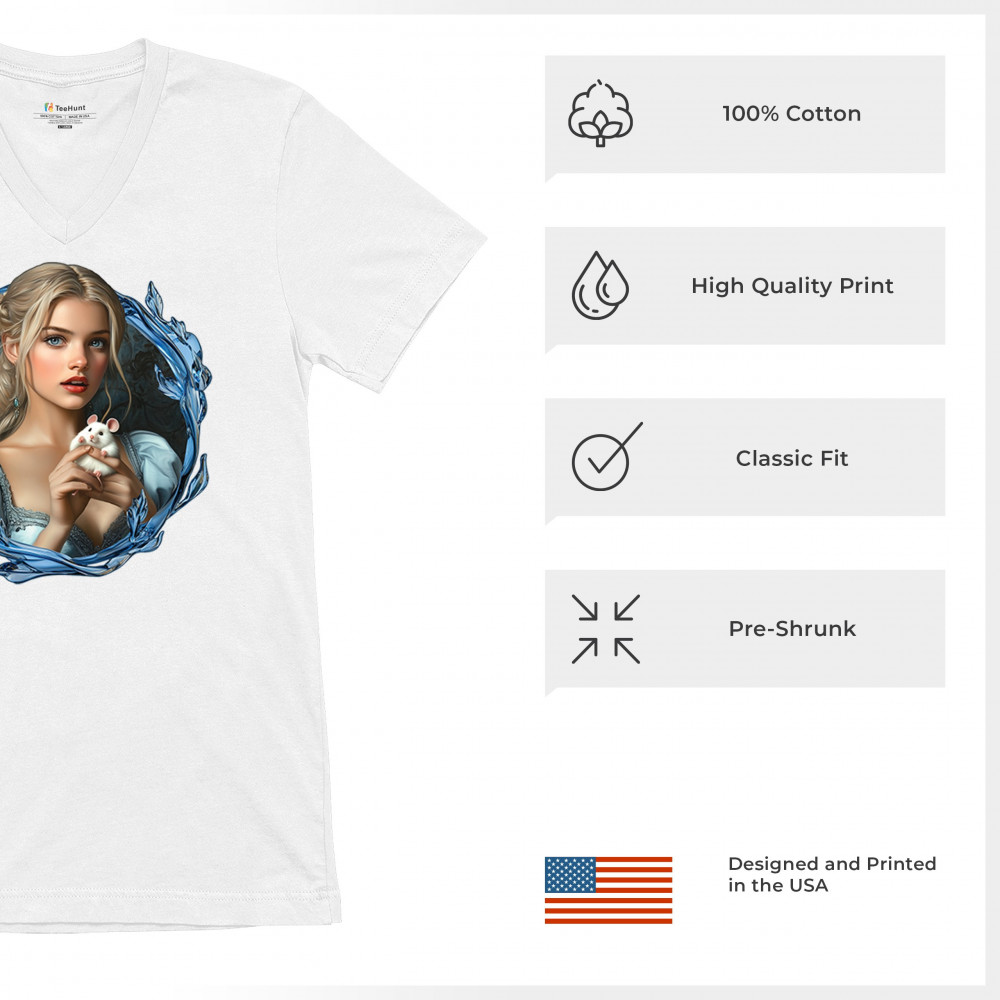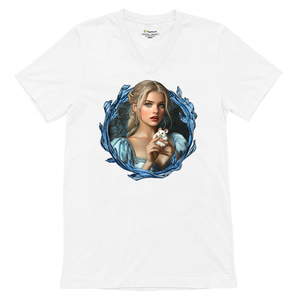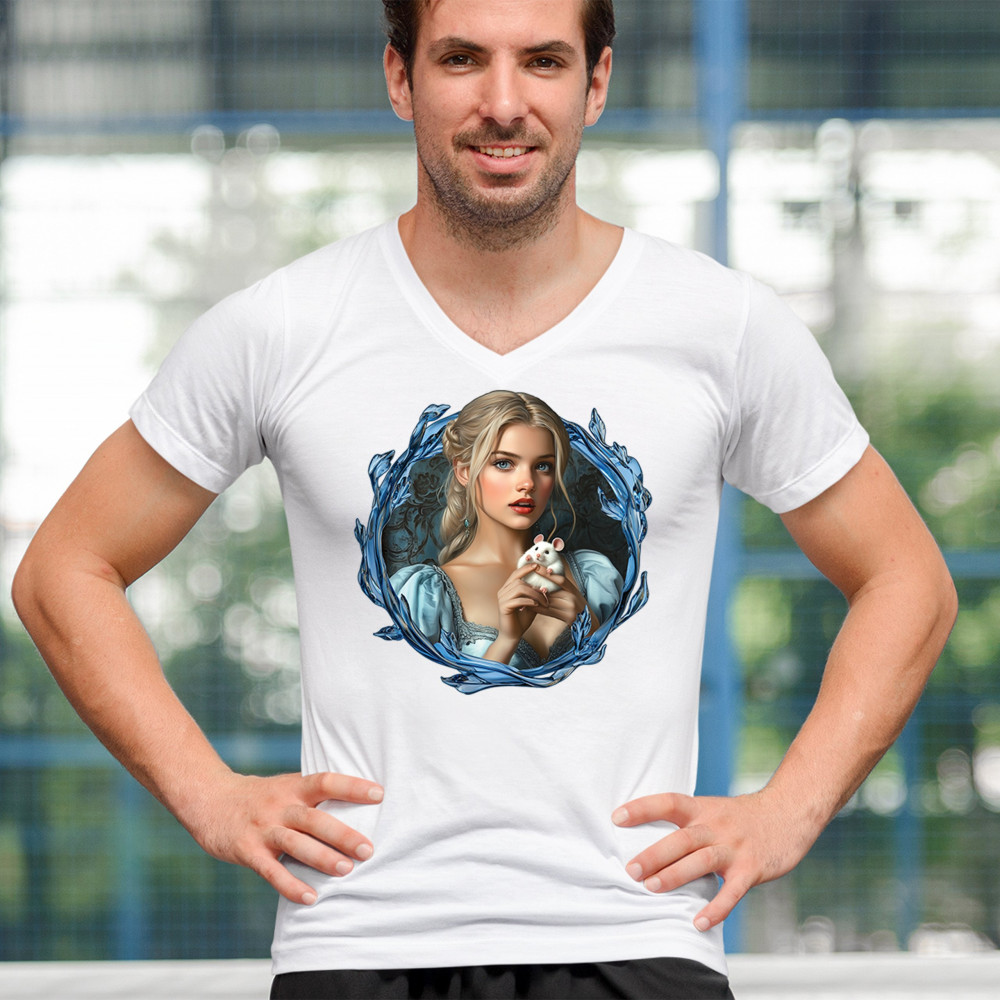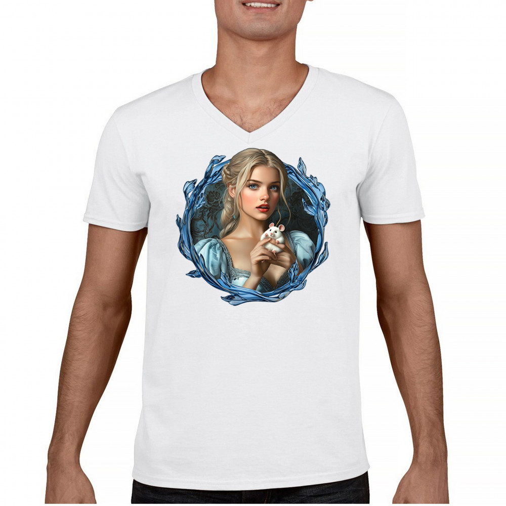 A whimsical design inspired by fairytales and Cinderella magic, featuring a blonde girl in a blue dress holding a white mouse. The icy blue leaf frame evokes enchantment and transformation. With soft, vintage tones and a dreamy feel, it’s a charming tribute to kindness, fantasy, animal companionship, and gentle storytelling magic.
