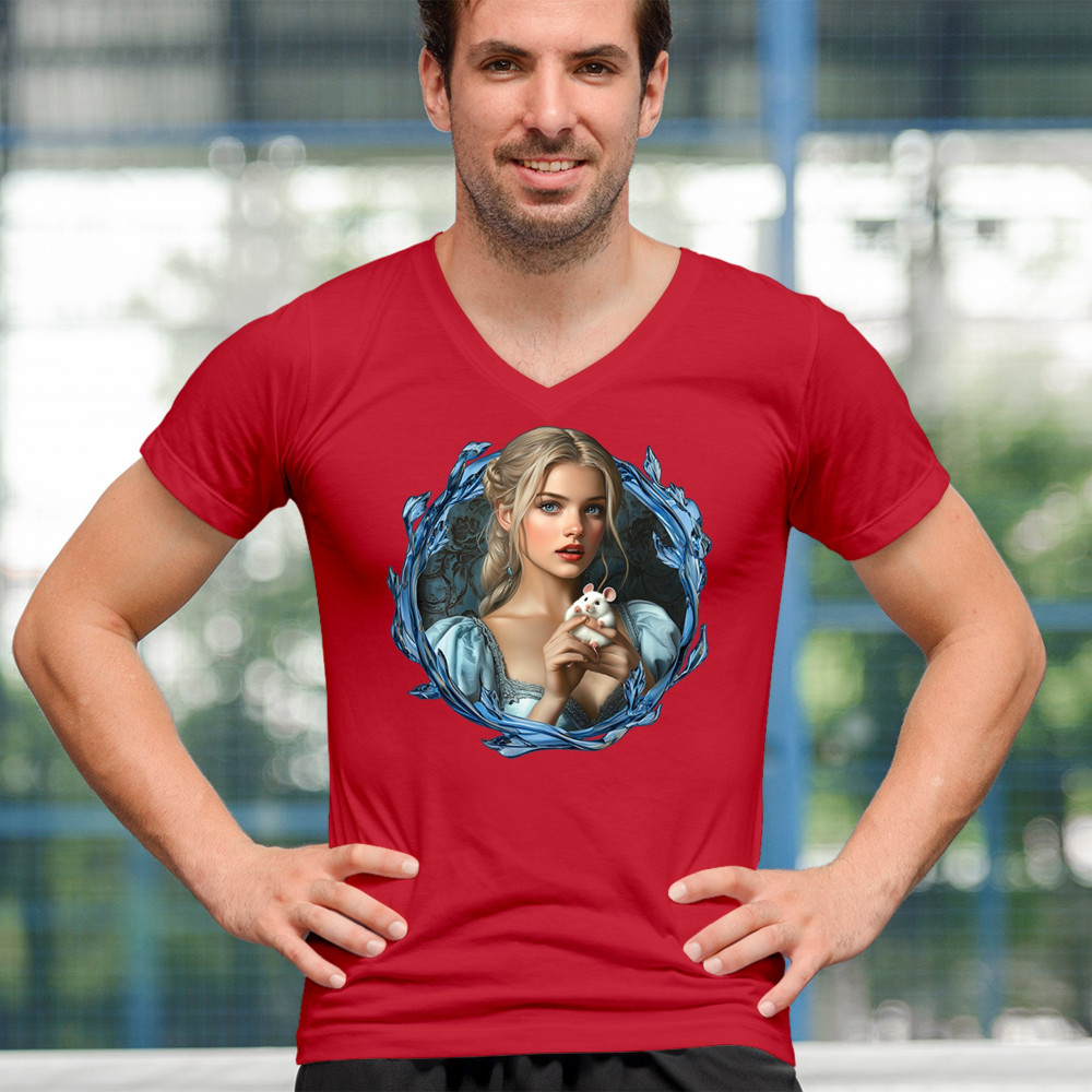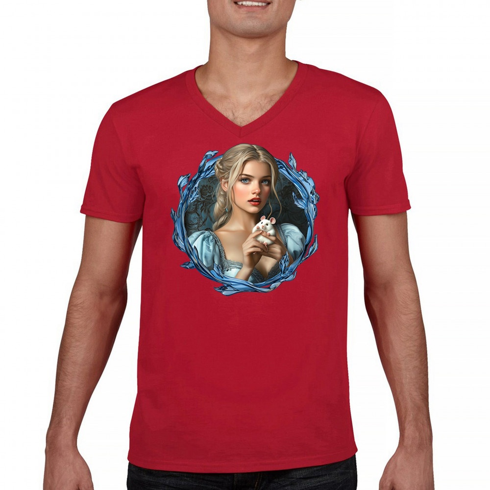 A whimsical design inspired by fairytales and Cinderella magic, featuring a blonde girl in a blue dress holding a white mouse. The icy blue leaf frame evokes enchantment and transformation. With soft, vintage tones and a dreamy feel, it’s a charming tribute to kindness, fantasy, animal companionship, and gentle storytelling magic.