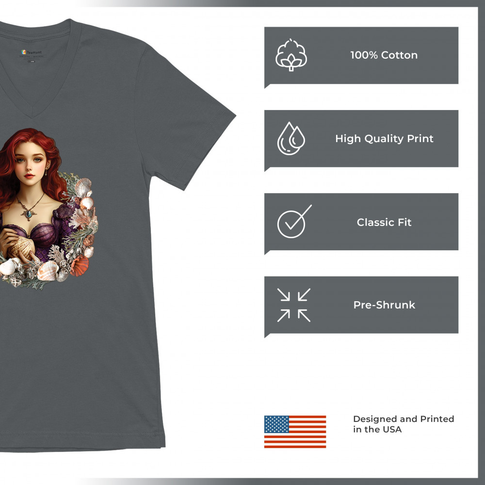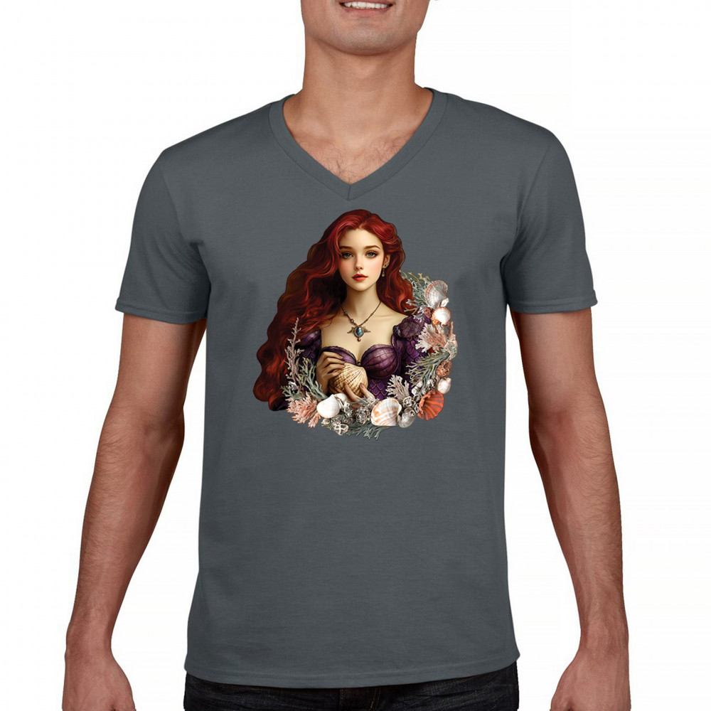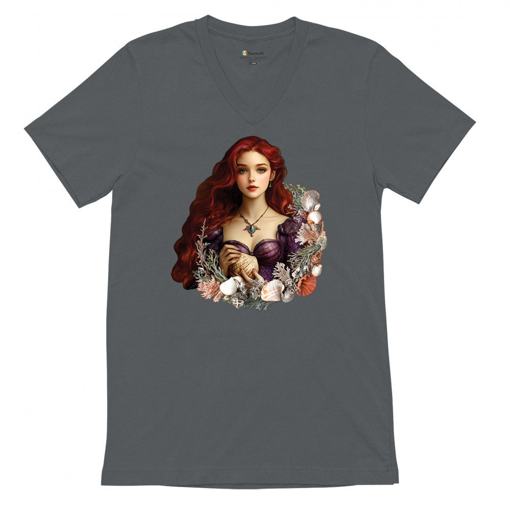 Inspired by mystical ocean themes, this design features a fantasy red-haired girl in a seashell dress, cradling a large shell. She is framed by coral, seaweed, and a shimmering array of ocean shells. With nods to classic mermaid lore and fairytale storytelling, it's perfect for fans of fantasy creatures, marine magic, and romantic ocean legends.