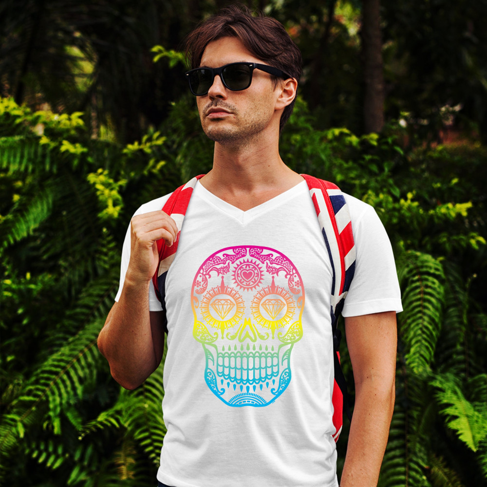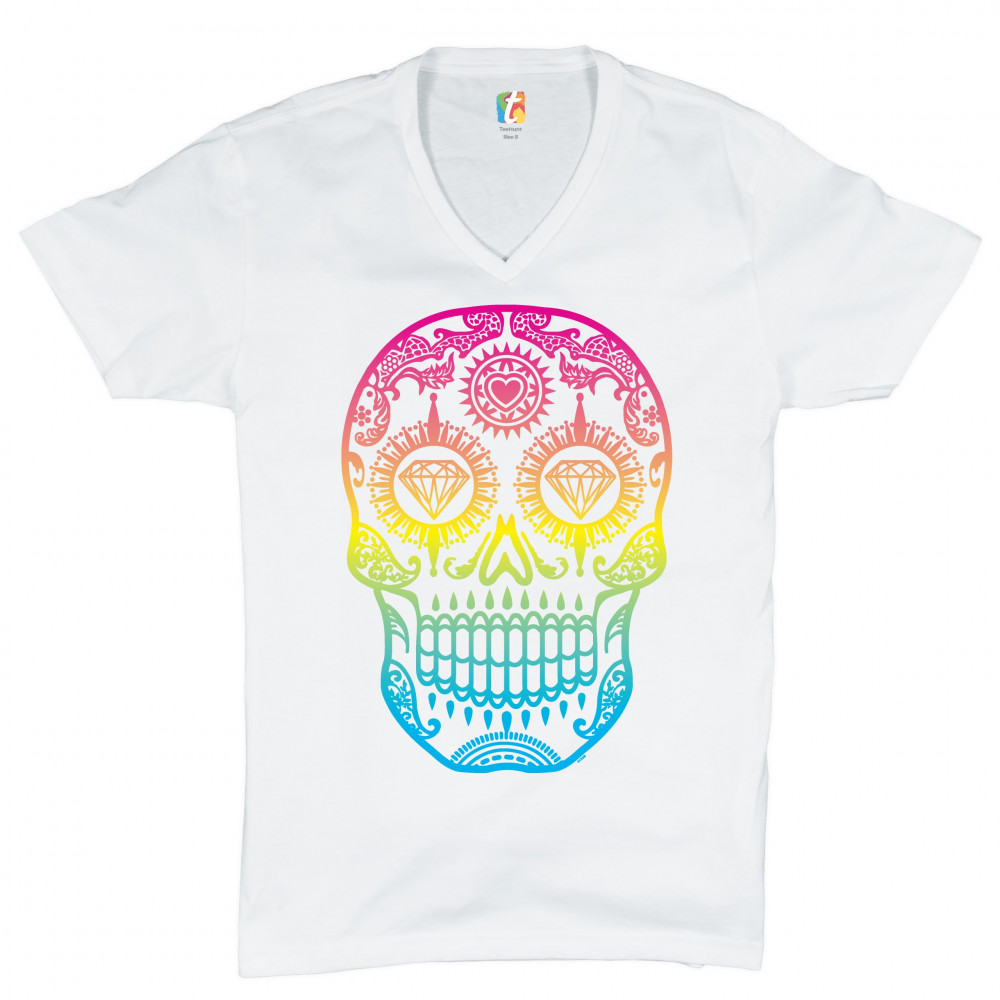 SUGAR SKULL CALAVERA DIAMOND EYES v-neck t-shirt day of the dead tee white