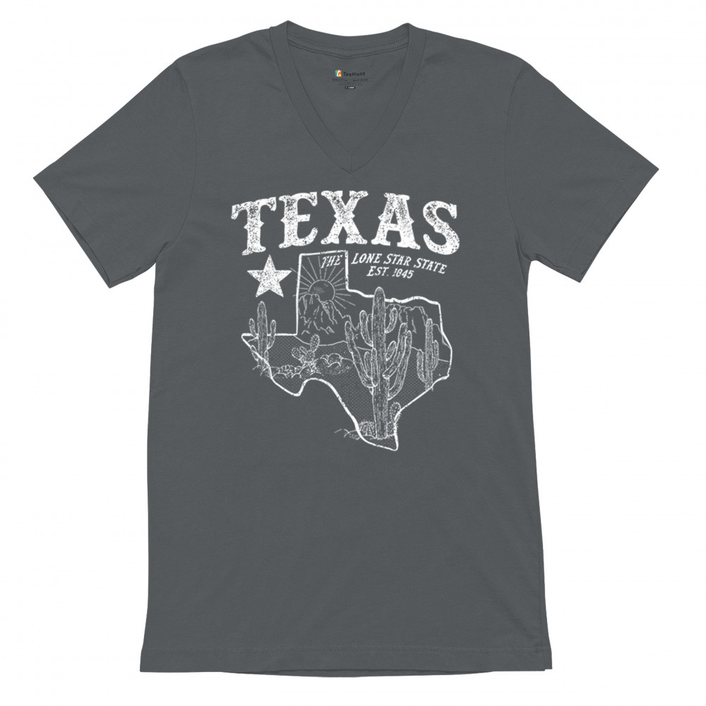 Vintage Texas pride design with cactus, mountains, Lone Star symbol, and 1845 tribute—perfect for rodeos and western events.