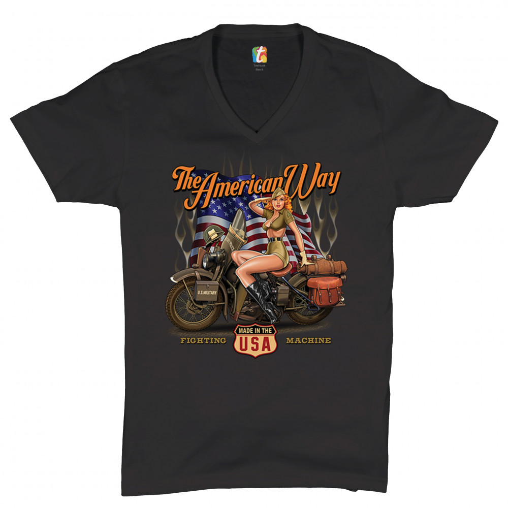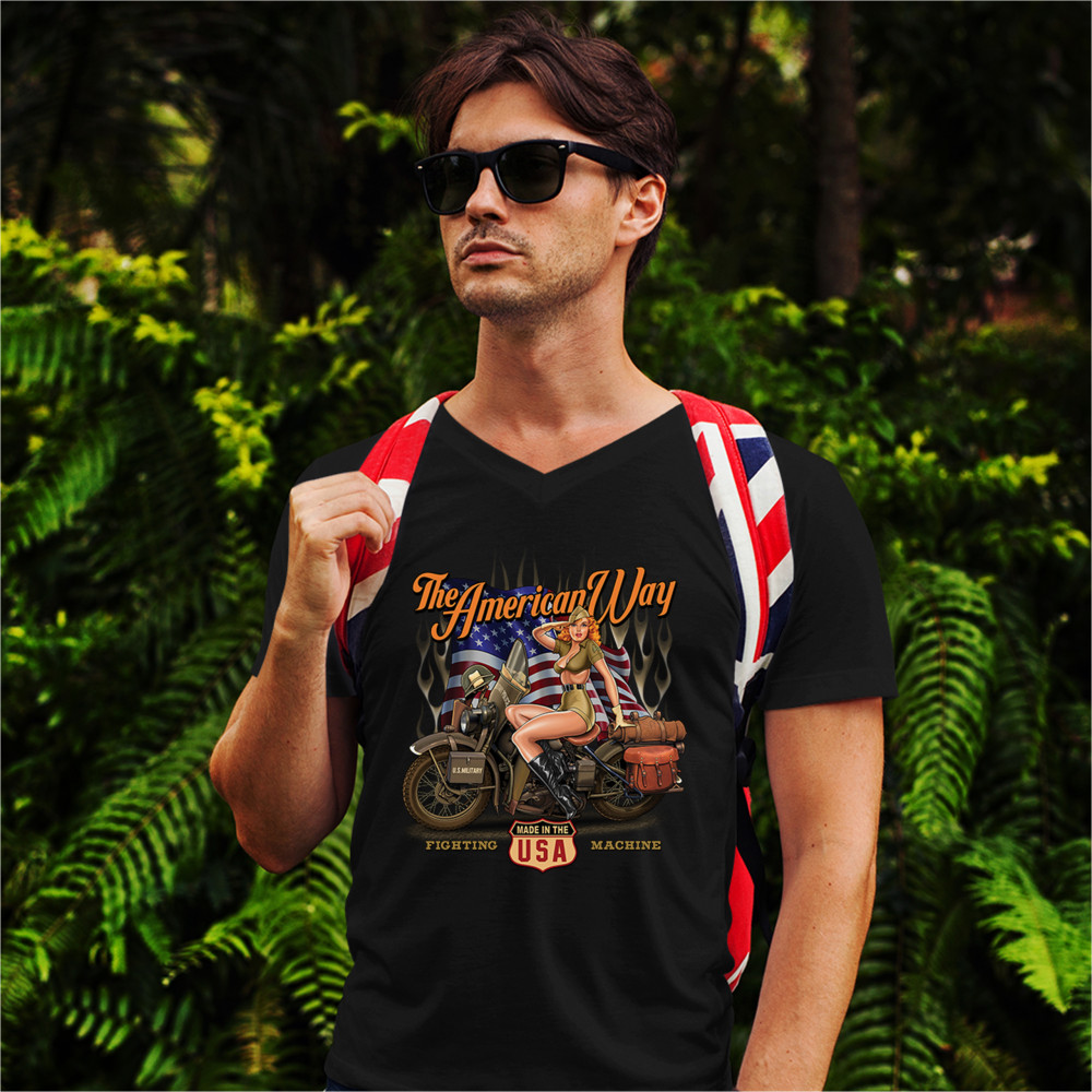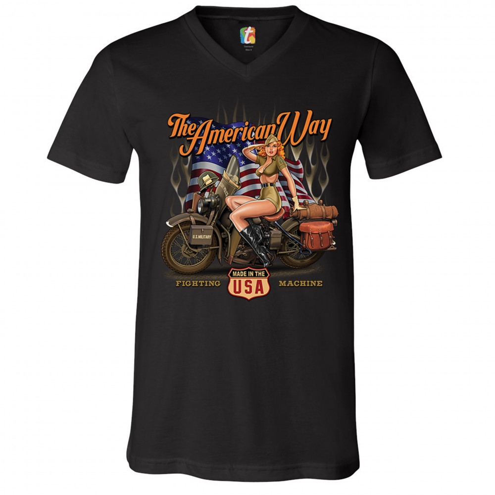A print featuring a beautiful pin-up girl in leather boots sitting on a U.S. military motorcycle. There is the American Flag in the background and the words "The American Way" above it. At the bottom of the picture there is a shield which says: "made in the USA". "Fighting Machine" is written under the motorcycle's wheels. A great choice for a motorcycle enthusiast.
