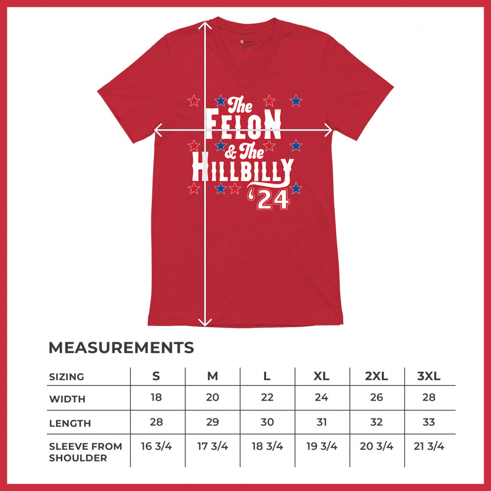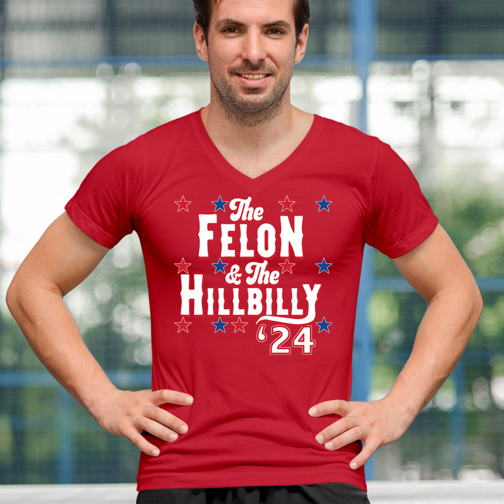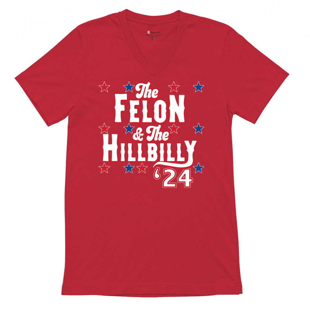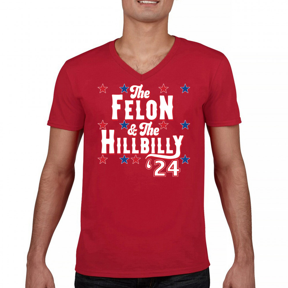 Humorous pro-Trump and Vance design for the 2024 election. "The Felon & The Hillbilly '24" captures conservative pride and humor in one bold statement.
