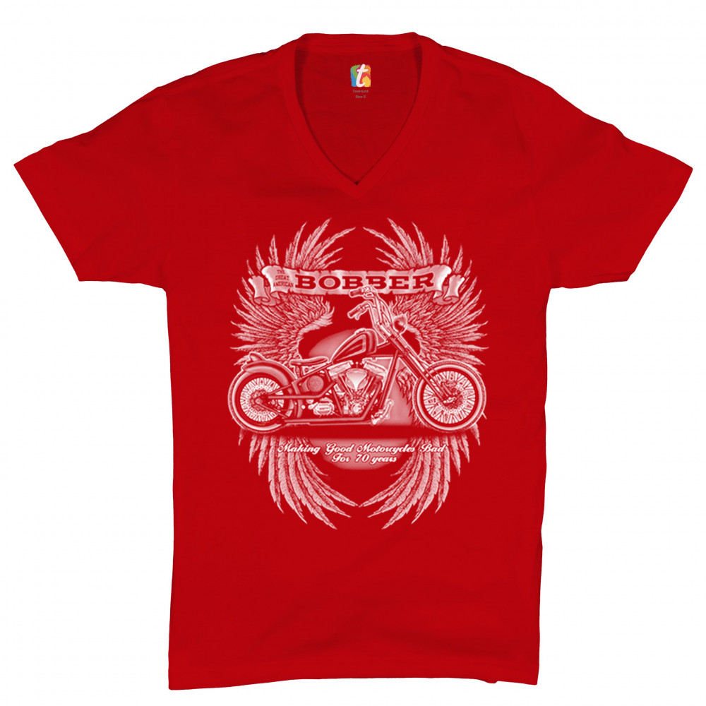 A print featuring a bobber motorcycle and a pair of wings in the background. At the top there is a stripe with "The great American bobber" written on it. At the bottom the print says: "making good motorcycles bad for 70 years". A great choice for a motorc